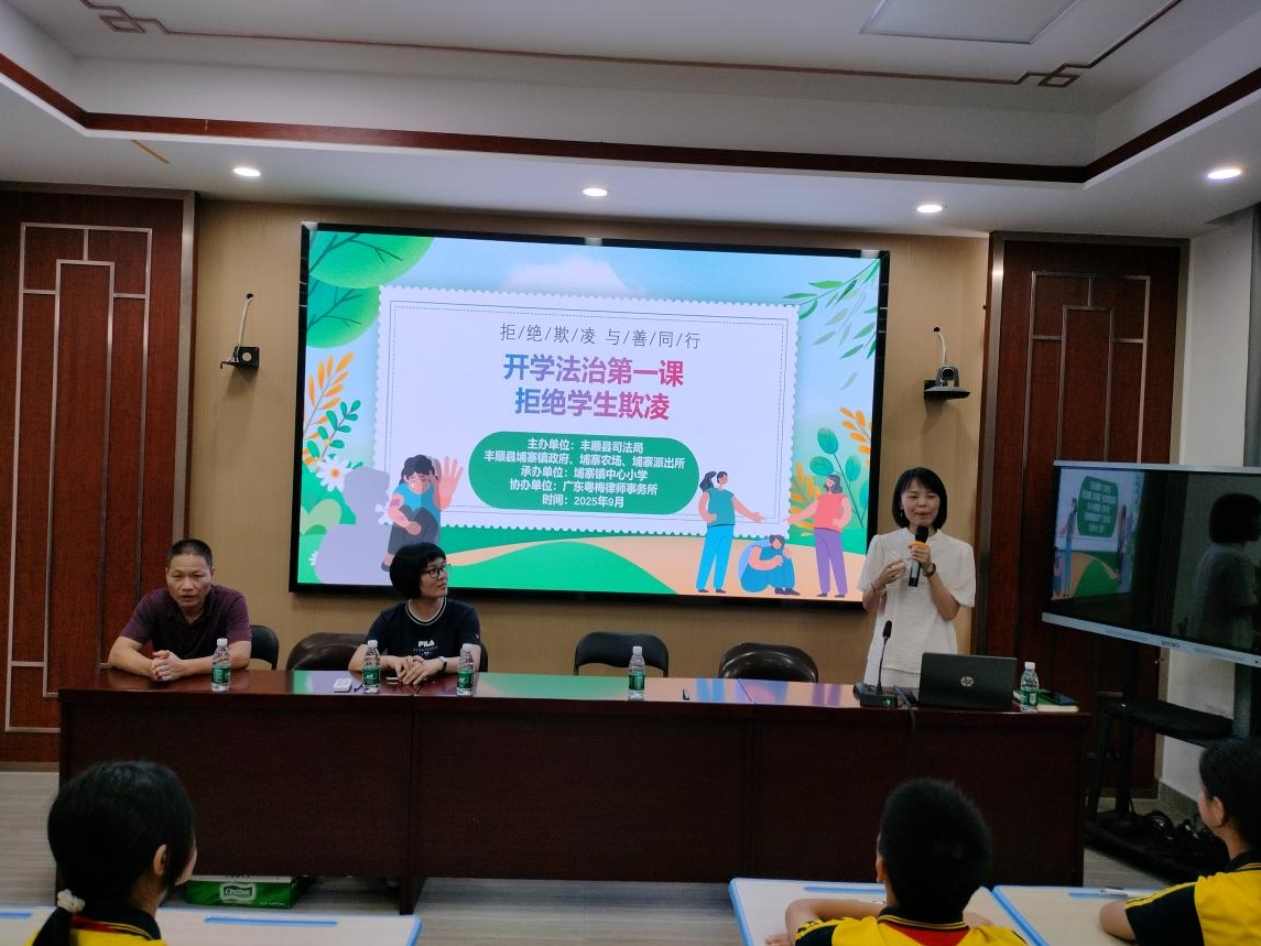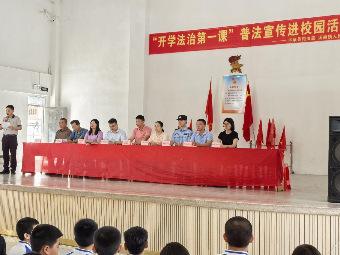 9 月 12日, 丰顺县司法局汤南司法所联合汤南镇人民政府、汤南派出所、汤南镇妇联等部门,组织驻村律师曾繁华到汤南镇新埔园村四维小学开展“开学法治第一课”普法宣传进校园活动。师生500余人参加法治讲座,通过案例解析、提问互动等方式帮助学生树立法治意识,现场普法气氛热烈而有序。
