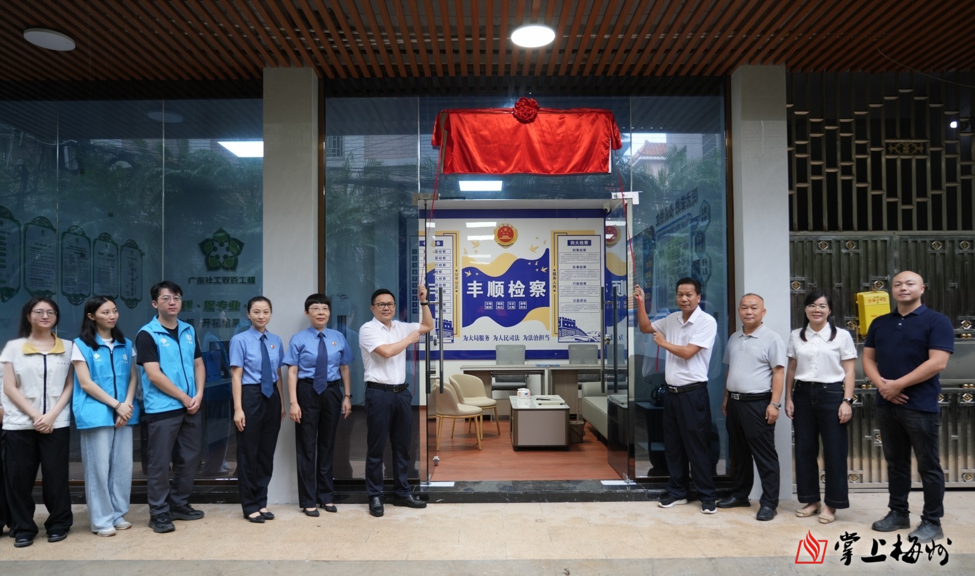 揭牌仪式上,饶富将、李炎飞等共同为“丰顺县人民检察院检察服务站”、“汤坑镇社会工作服务点”、“丰顺县人民检察院未成年人检察工作服务站”以及“丰顺县12355青少年服务中心”揭牌。