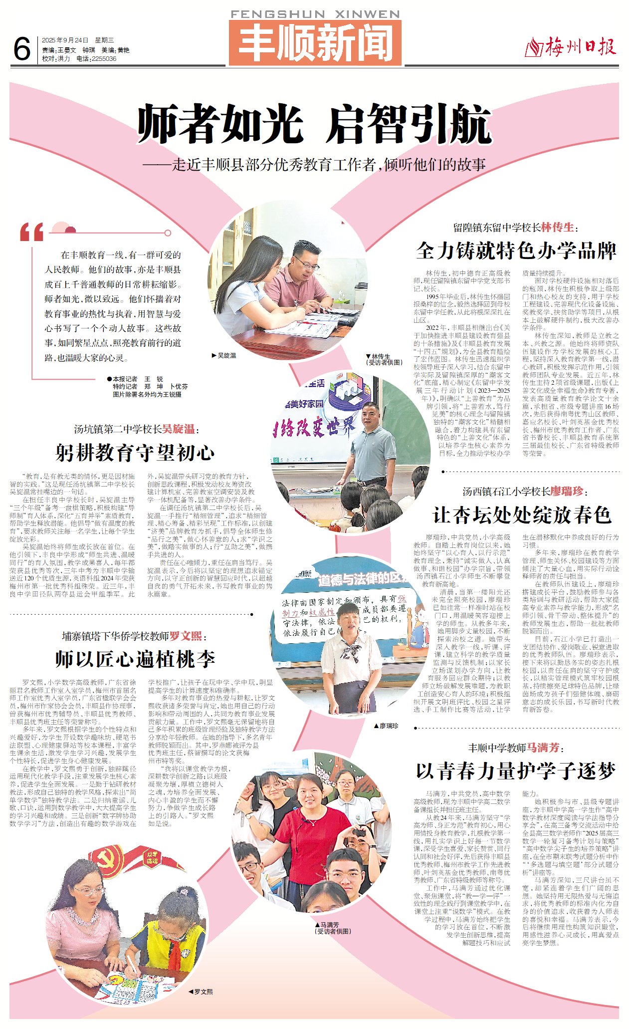在丰顺教育一线,有一群可爱的人民教师。他们的故事,亦是丰顺县成百上千普通教师的日常耕耘缩影。师者如光,微以致远。他们怀揣着对教育事业的热忱与执着,用智慧与爱心书写了一个个动人故事。这些故事,如同繁星点点,照亮教育前行的道路,也温暖大家的心灵。