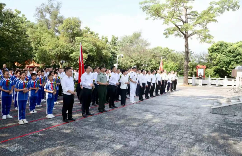 东山公园革命烈士纪念碑广场内庄严肃穆,气氛凝重。主持人首先向烈士纪念碑行鞠躬礼,随后宣布公祭仪式正式开始。全体人员整齐列队,面向纪念碑高唱中华人民共和国国歌;歌声落下,全场肃立,向革命先烈默哀。默哀结束后,少先队员齐声献唱《我们是共产主义接班人》,嘹亮的歌声传递出新时代少年继承先烈志向、勇担使命的坚定信念。