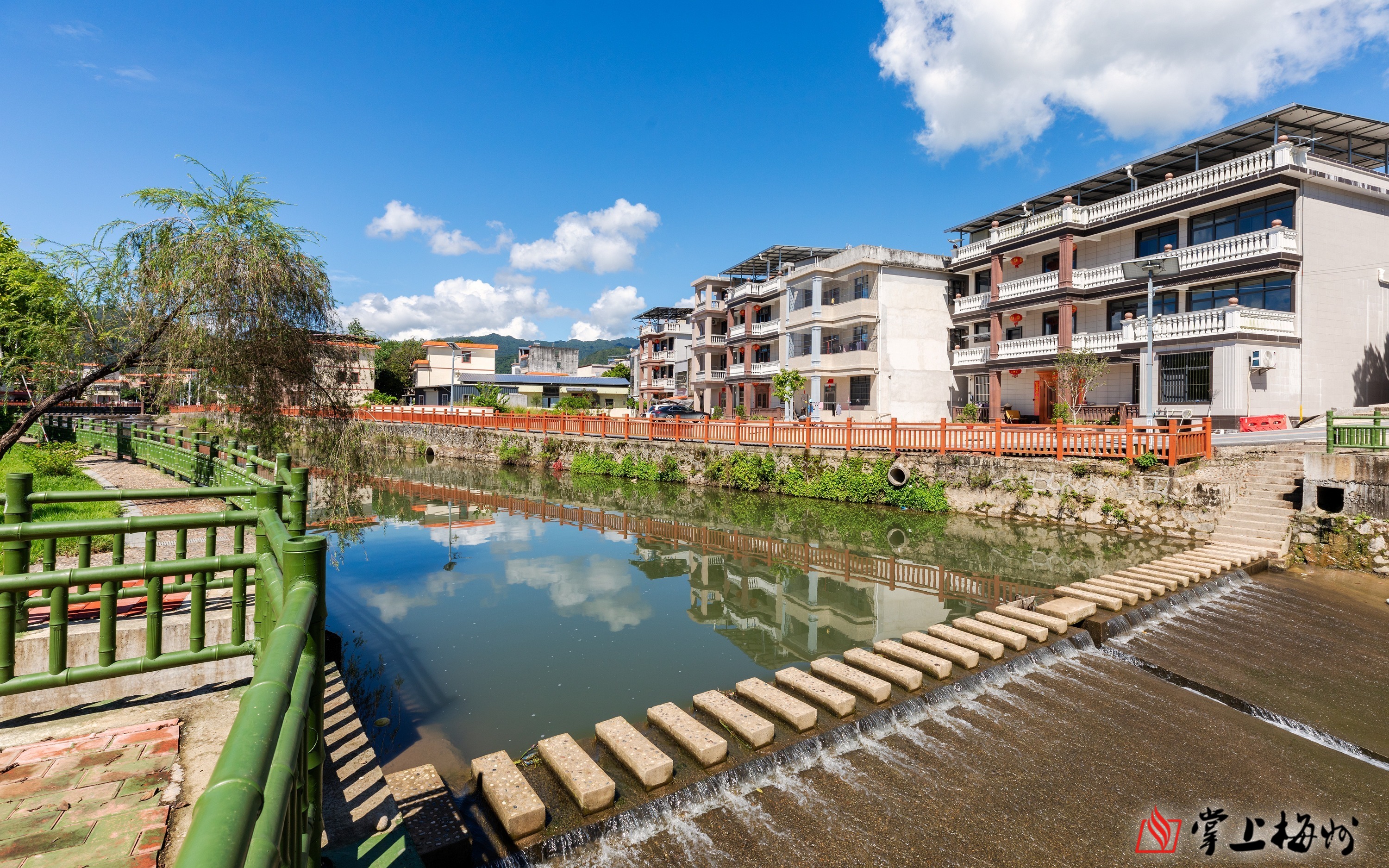 丰顺县汤西镇大罗村民房外立面整洁美观,风貌管控成效显著,与清澈河水、整洁环境相映成趣。