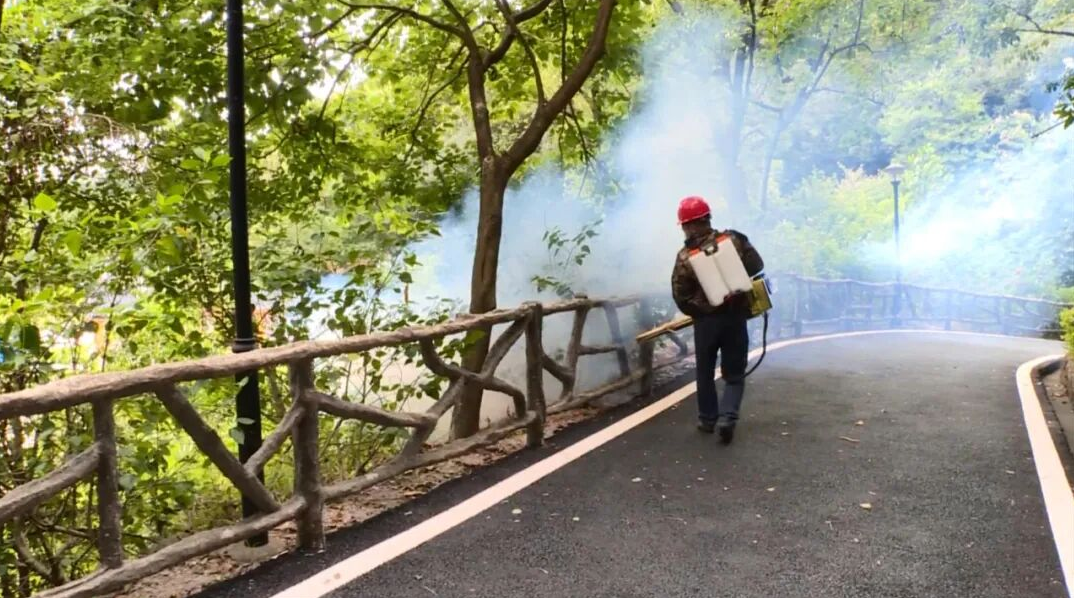 【县市政公用事业管理中心 园林公园股 股长 徐位达:加强蚊虫消杀工作,对所管辖公厕、公园绿篱等场所,在蚊虫活动高峰期(早上7~9时或下午16~19时)采用“超低容量喷雾”进行定期蚊虫消杀,减少病毒传播的可能性】
