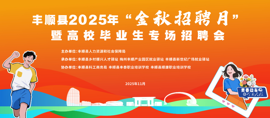 @广大求职者 坐标丰顺!“就”在金秋,“职”引未来现场招聘活动来了 2025-11-12 14:53 丰顺发布 2 为进一步做好企业用工保障和促进各类群体高质量充分就业,助力丰顺县“百千万工程”高质量发展,丰顺县人力资源和社会保障局定于11月14至21日16:00至20:00在汤坑镇新世纪广场举办2025年“金秋招聘月”暨高校毕业生现场招聘活动,届时将有立讯精密、锦顺科技、双十科技等20多家企业参加,提供超过1000个岗位,欢迎广大求职者踊跃参与,求职就业,共建美丽丰顺。 活动地点: 丰顺县新世纪文化广场 编辑:邹烁琦 审核:刘苑军