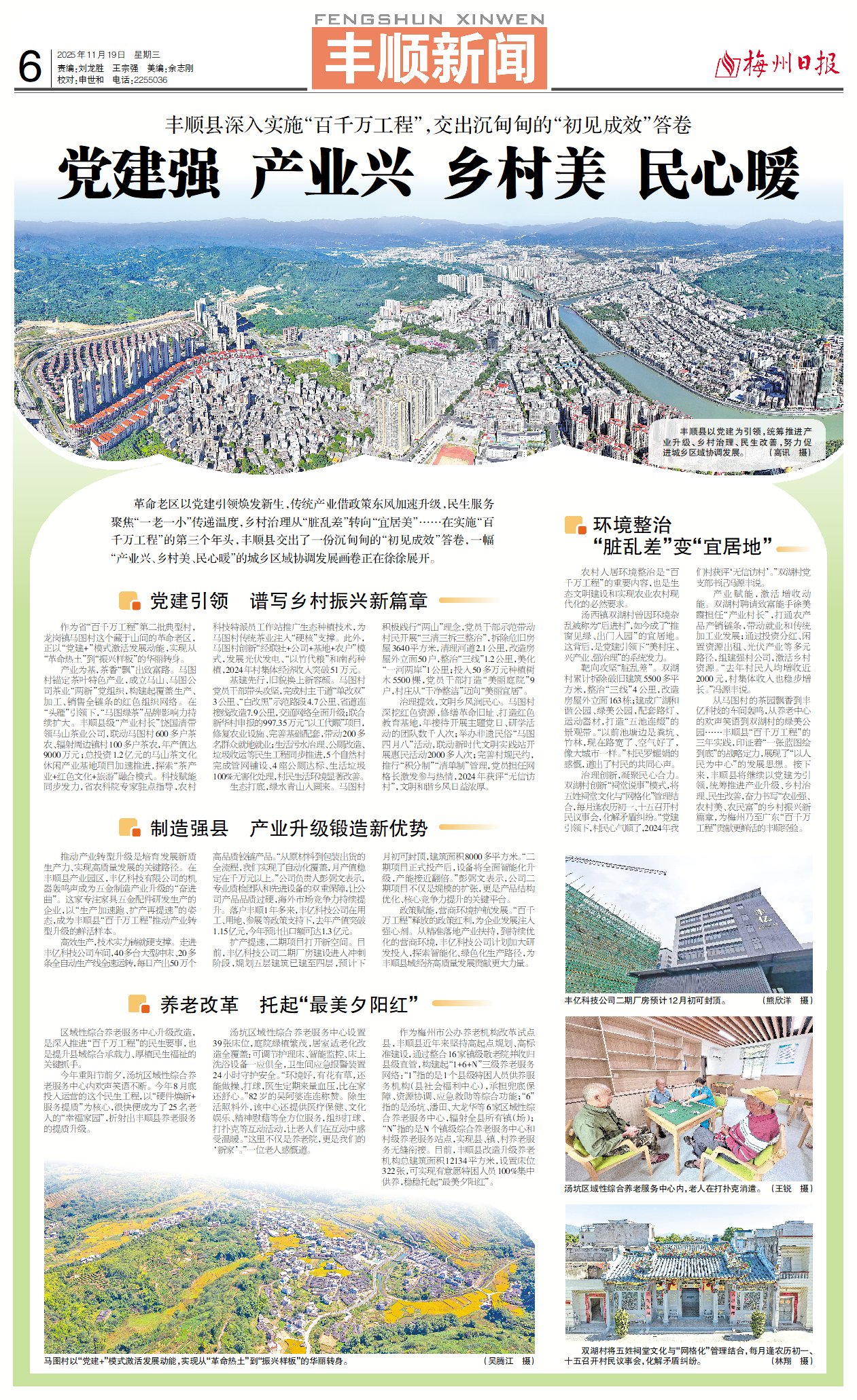 革命老区以党建引领焕发新生,传统产业借政策东风加速升级,民生服务聚焦“一老一小”传递温度,乡村治理从“脏乱差”转向“宜居美”……在实施“百千万工程”的第三个年头,丰顺县交出了一份沉甸甸的“初见成效”答卷,一幅“产业兴、乡村美、民心暖”的城乡区域协调发展画卷正在徐徐展开。
