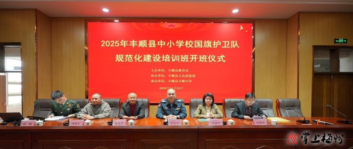 掌上梅州讯 日前,2025年丰顺县中小学校国旗护卫队规范化建设培训在丰顺中学举行。活动邀请原天安门国旗护卫队旗手曾嵘授课,通过为期两天的集中培训,为全县中小学校规范组建、系统训练国旗护卫队奠定坚实基础。丰顺县委常委、县人武部领导罗小平出席开班式并讲话,县直相关单位负责同志以及全县中小学教师代表参加仪式。
