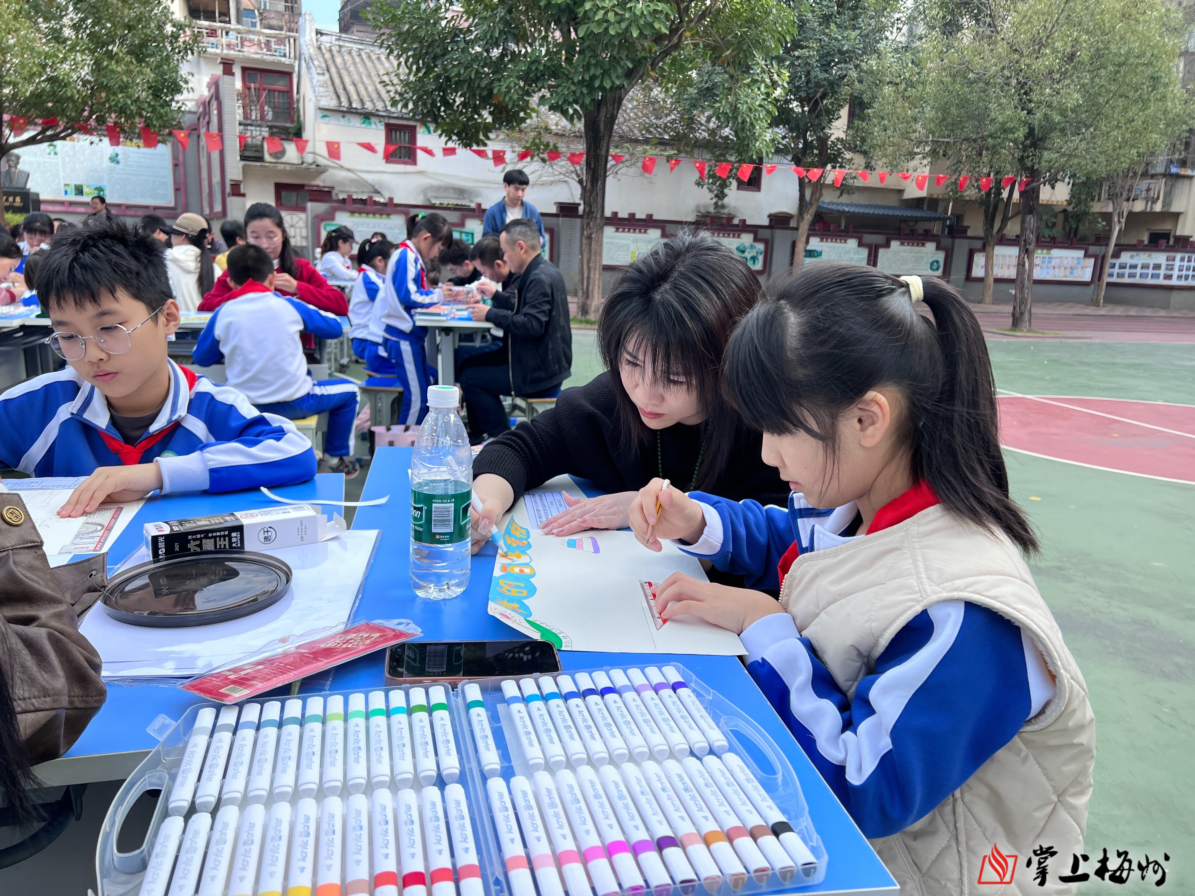 在学校负责人简短的致辞后,手绘大赛正式开始。操场上,一张张书桌被精心拼搭成“一百二十”字样,家长与孩子围坐其旁,紧扣“我心中的百年老校”主题携手创作。孩子们小手紧握画笔,兴致勃勃地勾勒着心中母校的模样,家长们则俯身相伴,和孩子一起构思图案,一幅幅饱含温情的彩绘作品渐渐成型,家长与孩子的脸上都洋溢着专注与喜悦。