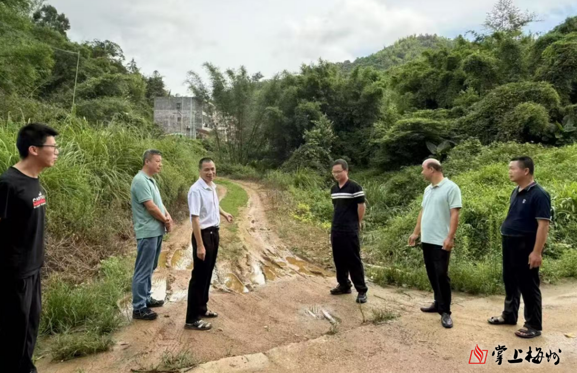 ▲图为人大代表彭淡水、朱章炉与工作队在清溪村实地查看道路