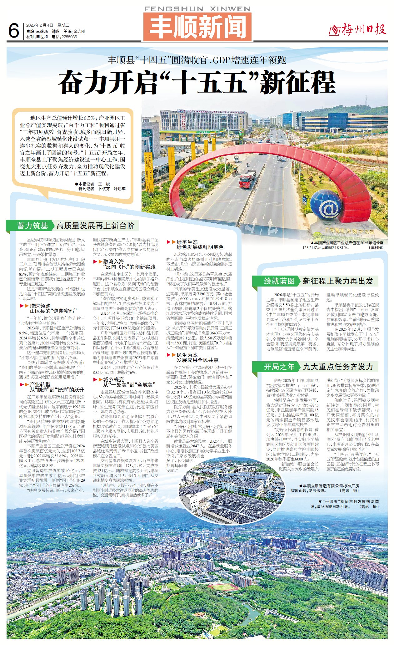 地区生产总值预计增长6.5%; 产业园区工业总产值实现突破;“百千万工程”顺利通过省“三年初见成效”督查验收;城乡面貌日新月异,入选全省新型城镇化建设试点……丰顺县用一连串扎实的数据和喜人的变化,为“十四五”收官之年画上了圆满的句号。“十五五”开局之年,丰顺全县上下聚焦经济建设这一中心工作,围绕九大重点任务齐发力,全力推动现代化建设迈上新台阶,奋力开启“十五五”新征程。