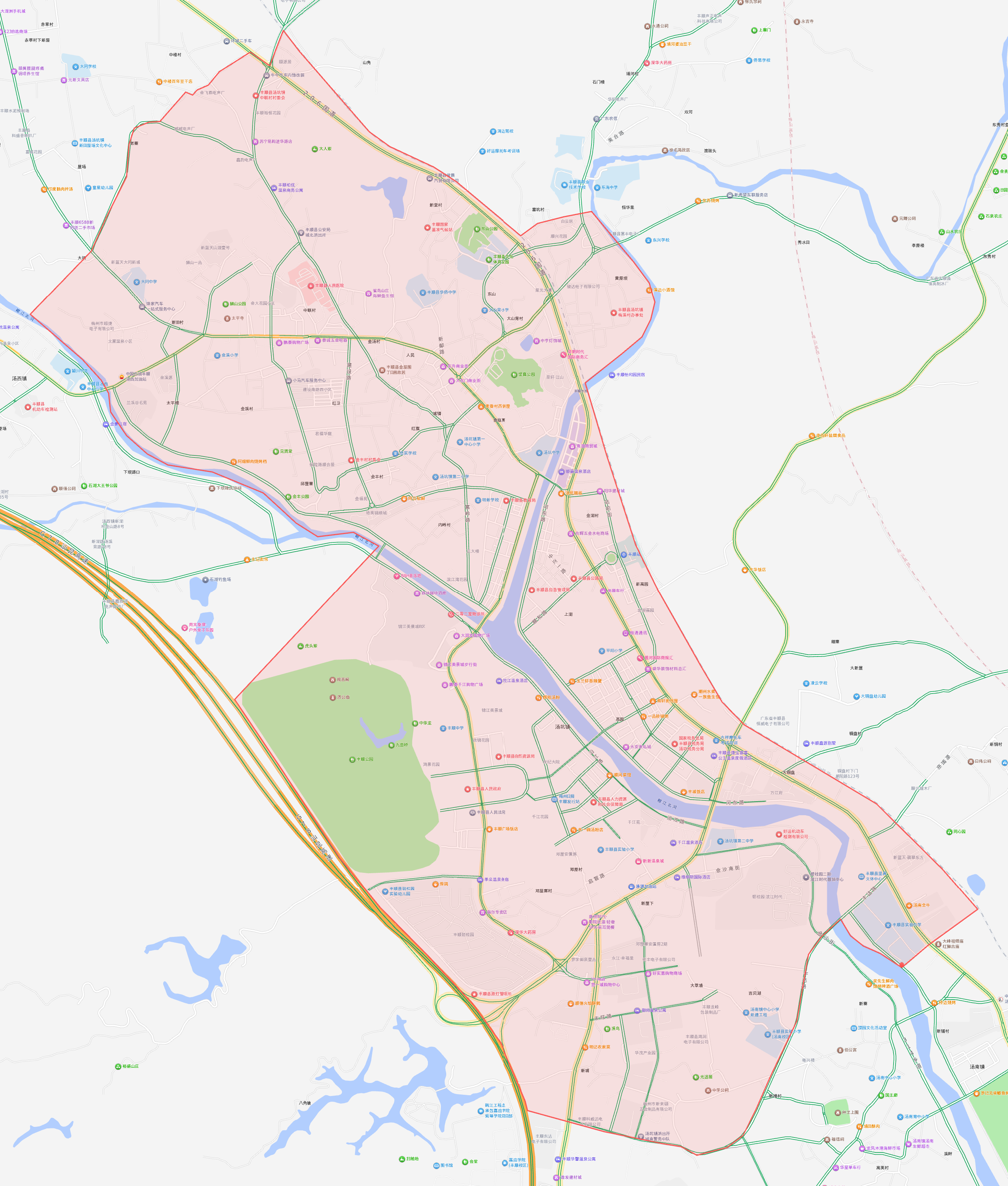 县城区域东至广梅汕铁路(含黄屋坝)、西至汕梅高速公路、南至丰达路、北至汤坑镇段桥。