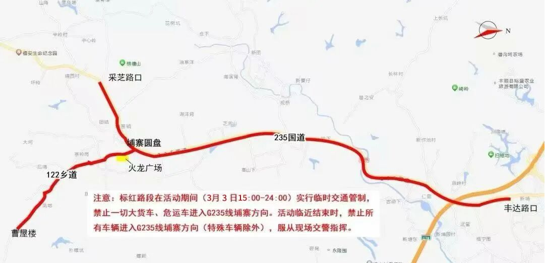2026年3月3日15时至24时,丰顺县公安局将对G235国道埔寨镇采芝路口至丰达路口(新南方青蒿药业)路段,G235国道与汤曼路交接路段实行临时交通管制。
