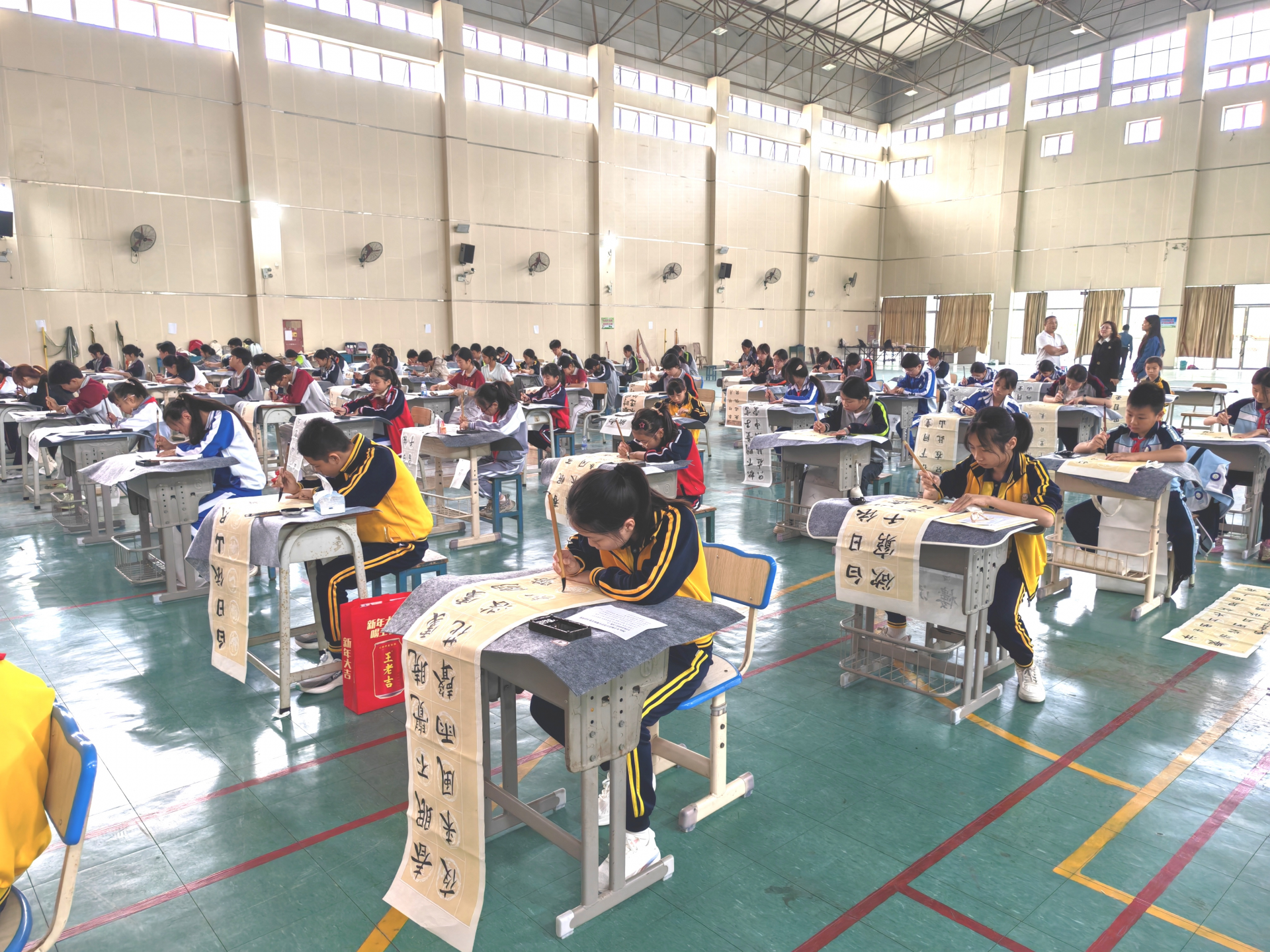 现场书法比赛随即在丰顺中学体育馆拉开帷幕。参赛选手有序签到入场,迅速进入状态。比赛过程中,选手们凝神静气,专注创作,或端庄秀丽,或苍劲雄浑,于方寸纸间尽显扎实功底与青春风采。整个赛场秩序井然,选手们独立完成作品,以纯粹的笔墨语言诠释书法艺术的独特魅力。