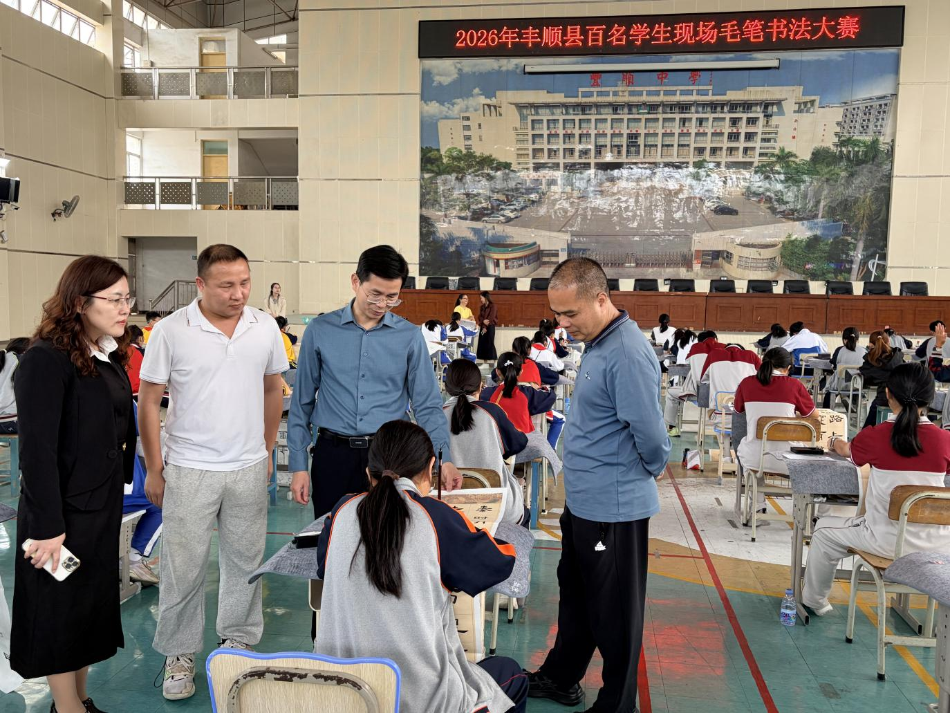 丰顺县教育局党组成员、副局长叶韩杰,丰顺中学党委书记徐文丰、校长张万春,嘉应学院宣传部宣传教育科科长、“双百行动”驻丰顺县服务队副队长邱锦炜,嘉应学院教师教育学院书法教研室主任罗滔裕,嘉应学院教师教育学院高辉老师,梅州市书法家协会理事、丰顺县书法家协会副会长罗志龙出席本次活动。全县百名爱好书法的学生齐聚一堂,共赴这场笔墨飘香的文化盛宴。
