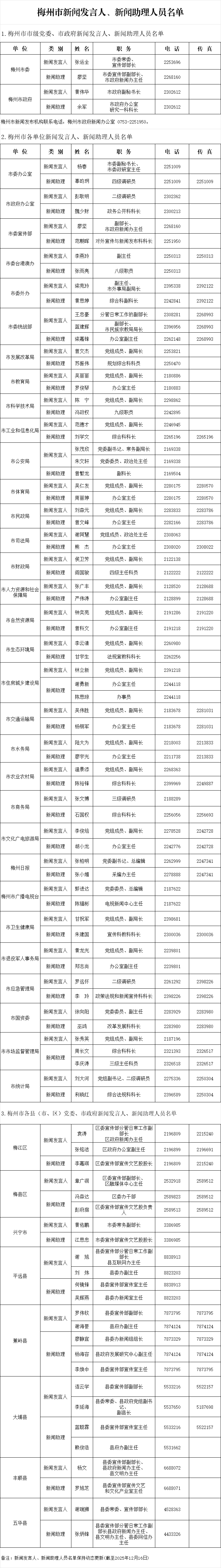 梅州市新闻发言人、新闻助理人员名单 2025-03-19 09:48 0 根据新闻发布工作有关要求,现公布2025年梅州市级党委、市政府及部分单位和各县(市、区)新闻发言人、新闻助理人员名单。 来源:梅州市政府新闻办公室 编辑:张晓珊 审核:练海林