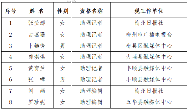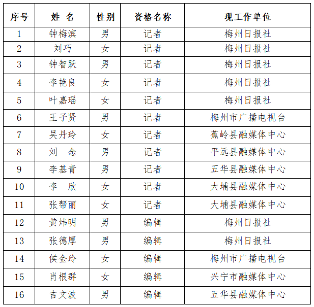 经梅州市新闻中(初)级专业技术资格评审委员会评审,钟梅滨等16人通过新闻中级职称评审,张莹娜等8人通过新闻初级职称评审,现予公示。公示期从2025年6月4日至2025年6月10日。