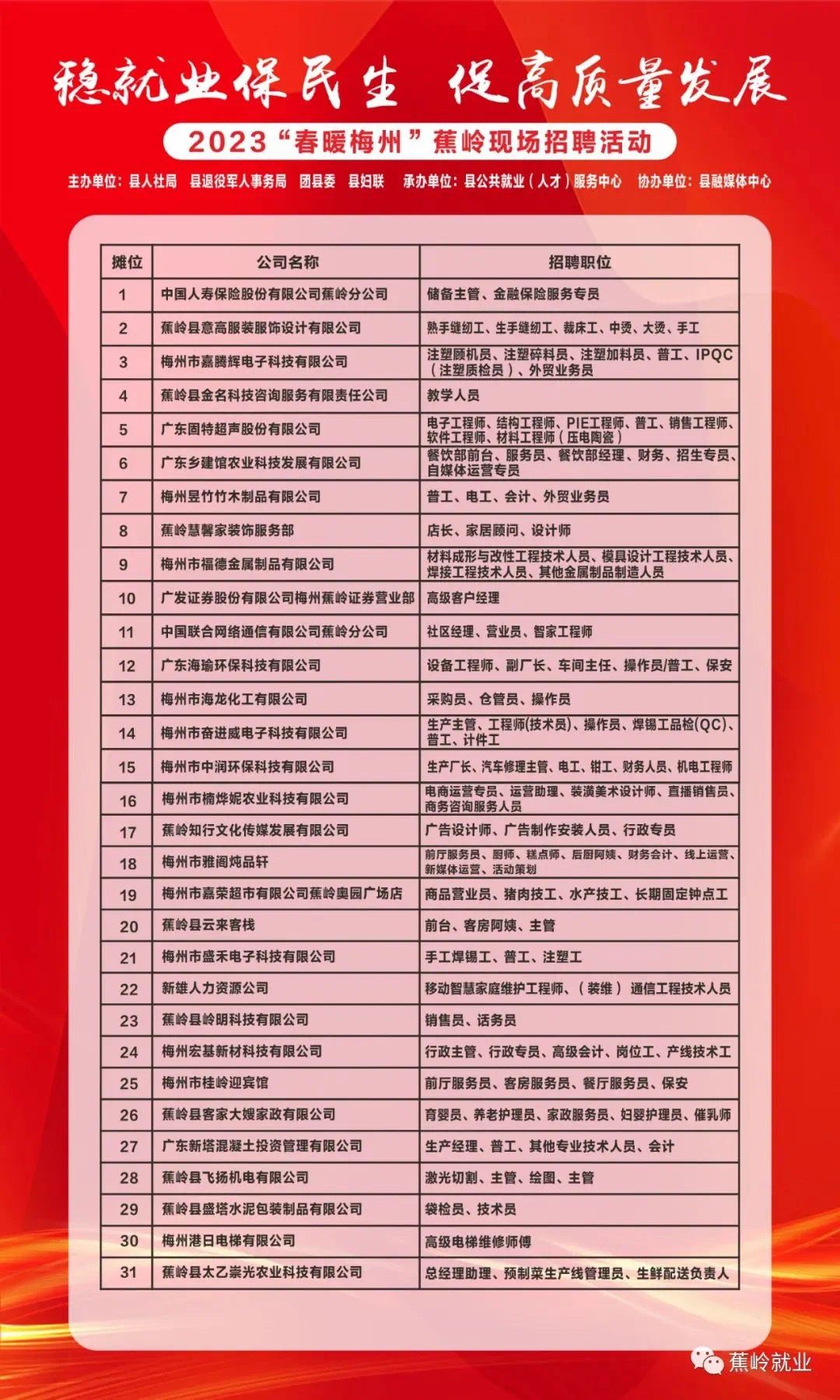 掌上梅州讯 金兔迎春,好岗任选。2月10日上午,蕉岭县将在蕉城镇龙门广场举办“稳就业保民生 促高质量发展”为主题的2023“春暖梅州”蕉岭现场招聘活动。