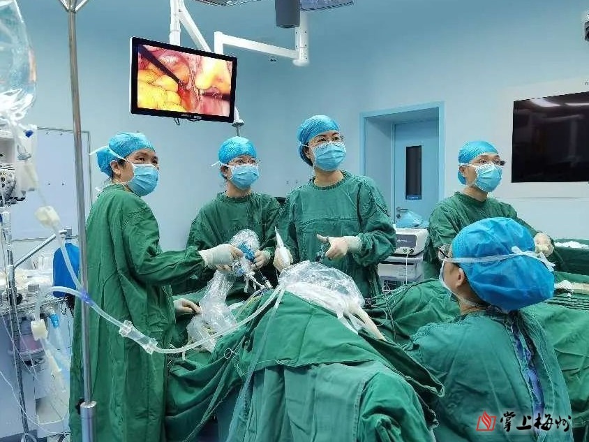 蕉岭县人民医院妇科医疗团队成功开展腹腔镜下“全子宫加双附件切除+骶韧带悬吊+阴道前后壁修补术”。(医院供图)