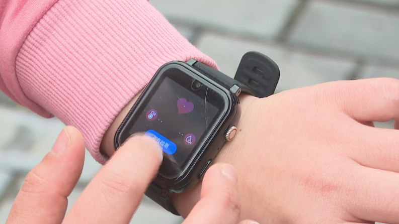 志愿者说:“这里有紧急呼叫按键,这个长按,后台就可以看到,那边就会及时回电话给老人,问他们的情况,这个是心率测试的。”