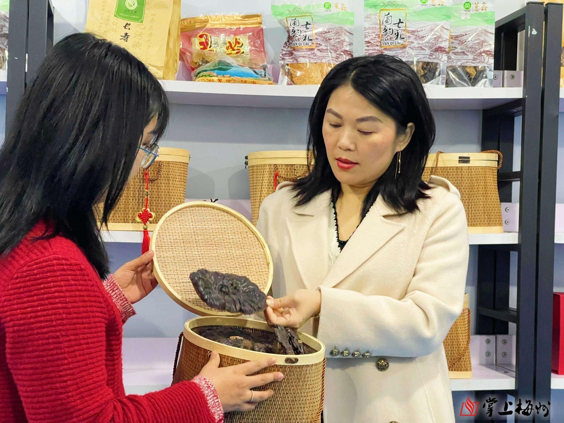丘春兰向顾客展示当地特色农产品。(丘琼 摄)