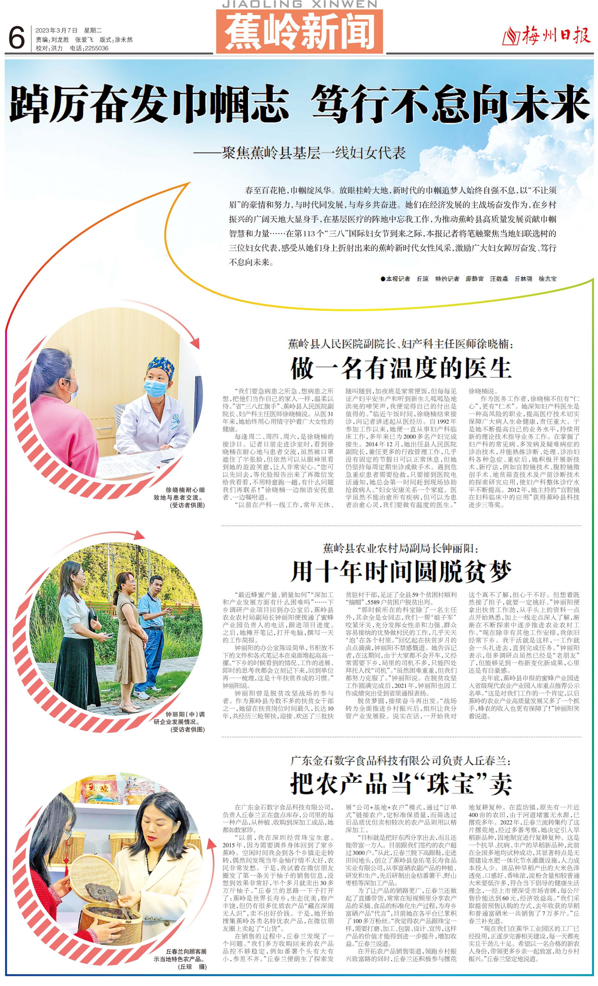 春至百花艳,巾帼绽风华。放眼桂岭大地,新时代的巾帼追梦人始终自强不息,以“不让须眉”的豪情和努力,与时代同发展,与寿乡共奋进。她们在经济发展的主战场奋发作为,在乡村振兴的广阔天地大显身手,在基层医疗的阵地中忘我工作,为推动蕉岭县高质量发展贡献巾帼智慧和力量……在第113个“三八”国际妇女节到来之际,本报记者将笔触聚焦当地妇联选树的三位妇女代表,感受从她们身上折射出来的蕉岭新时代女性风采,激励广大妇女踔厉奋发、笃行不怠向未来。