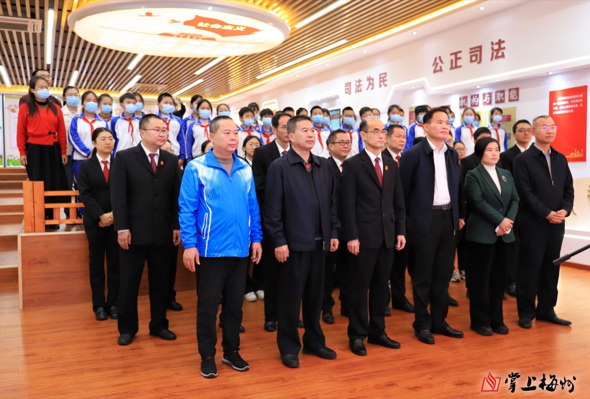 掌上梅州讯 为了深入学习贯彻习近平法治思想,进一步丰富青少年法治教育载体,大力创新青少年法治教育形式,3月30日,蕉岭法院与蕉岭县教育局共同举行“蕉岭县中小学生法治教育实践基地及模拟法庭揭牌仪式”,蕉岭县委副书记、政法委书记林文建,县政府副县长张慧,县法院院长刘志平,县教育局局长徐金伟,县司法局局长傅建新,县法院领导班子成员,县教育局部分领导,“法润”普法服务队部分队员,蕉城镇中心小学师生代表参加仪式。