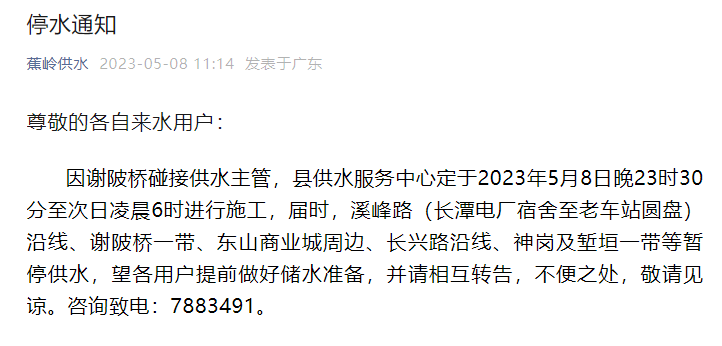 因谢陂桥碰接供水主管,蕉岭县供水服务中心定于2023年5月8日晚23时30分至次日凌晨6时进行施工,届时,溪峰路(长潭电厂宿舍至老车站圆盘)沿线、谢陂桥一带、东山商业城周边、长兴路沿线、神岗及堑垣一带等暂停供水,望各用户提前做好储水准备,并请相互转告,不便之处,敬请见谅。咨询致电:7883491。