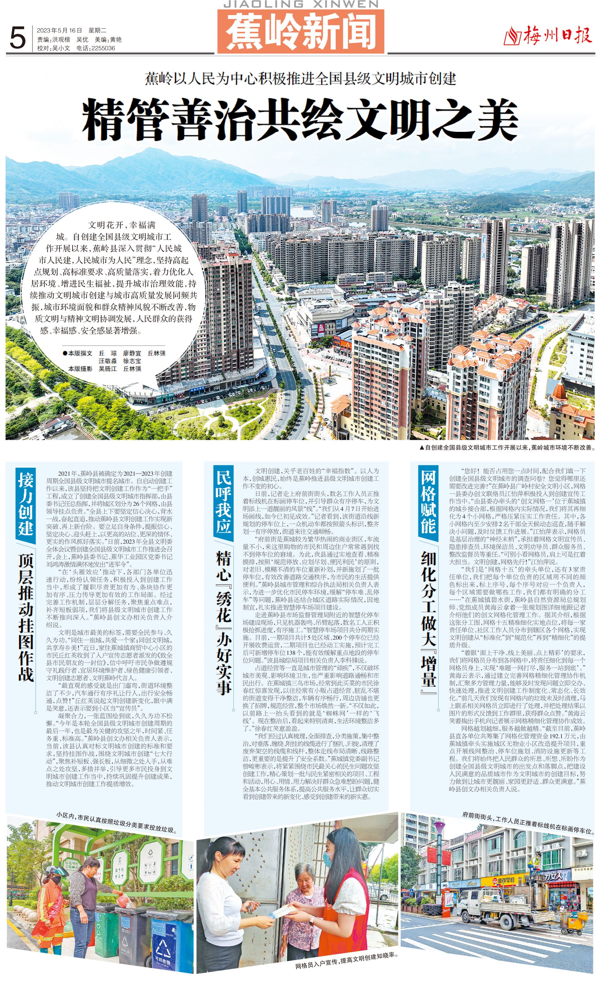 “您好!能否占用您一点时间,配合我们填一下创建全国县级文明城市的调查问卷?您觉得哪里还需要改进完善?”在蕉岭县广岭村安全文明小区,网格一县委办创文联络员江怡萍积极投入到创建宣传工作当中。“由县委办牵头的‘创文网格一’位于蕉城镇的城乡接合部,根据网格内实际情况,我们将其再细化为4个小网格,严格压紧压实工作责任。其中,各小网格内至少安排2名干部全天候动态巡查,随手解决小问题,及时反馈工作进展。”江怡萍表示,网格员是基层治理的“神经末梢”,承担着网格文明宣传员、隐患排查员、环境保洁员、文明劝导员、群众服务员、整改监督员等重任。“可别小看网格员,肩上可是扛着大担当。文明创建,网格先行!”江怡萍说。
