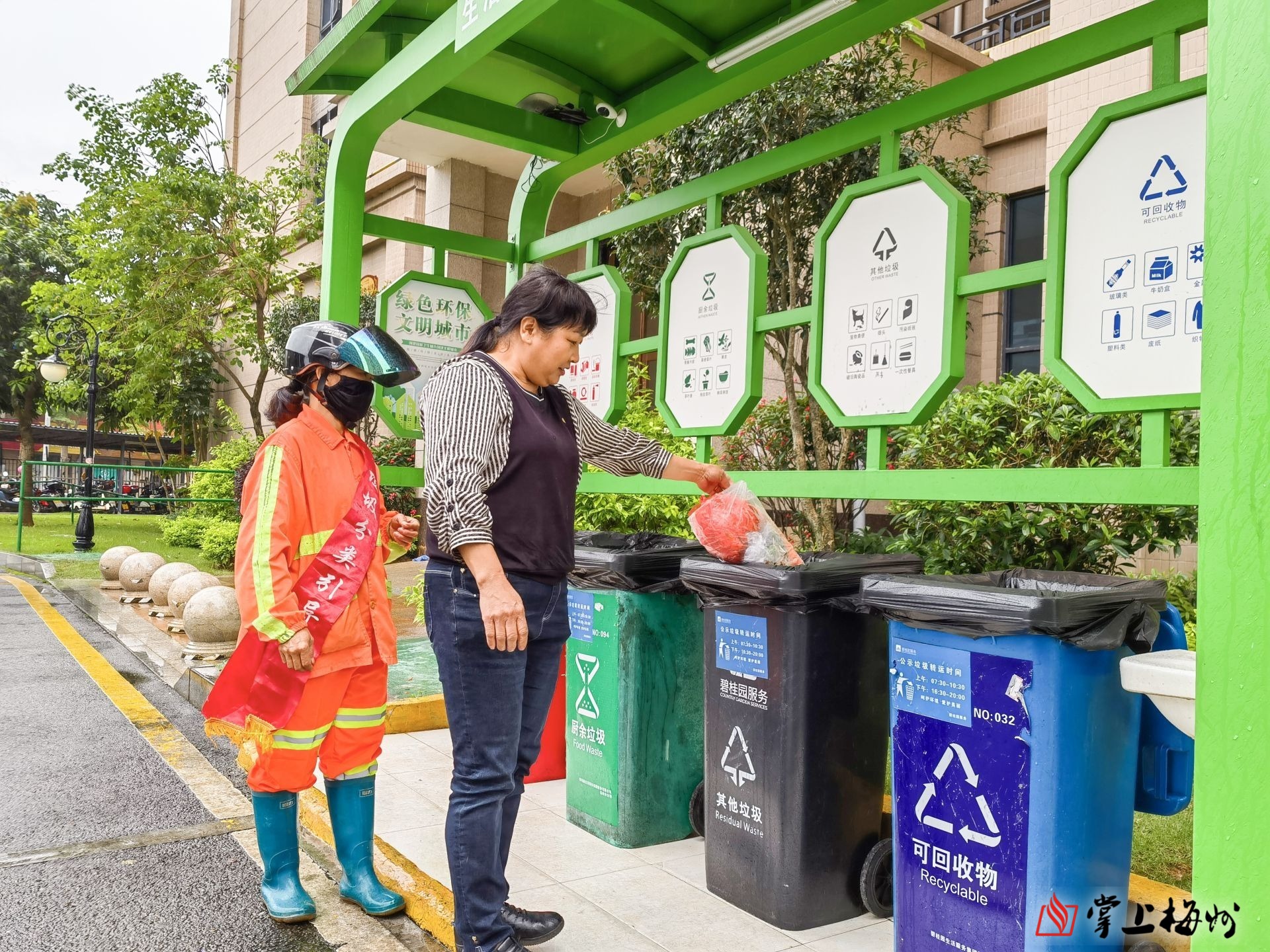 小区内,市民认真按照垃圾分类要求投放垃圾。