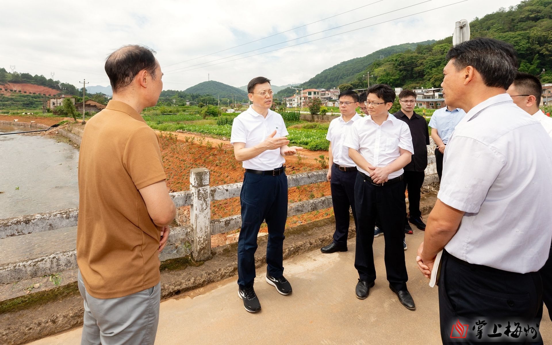 马正勇在蕉岭县新铺镇金沙村调研并听取新铺镇垦造水田和石扇河水生态修复工作情况介绍。