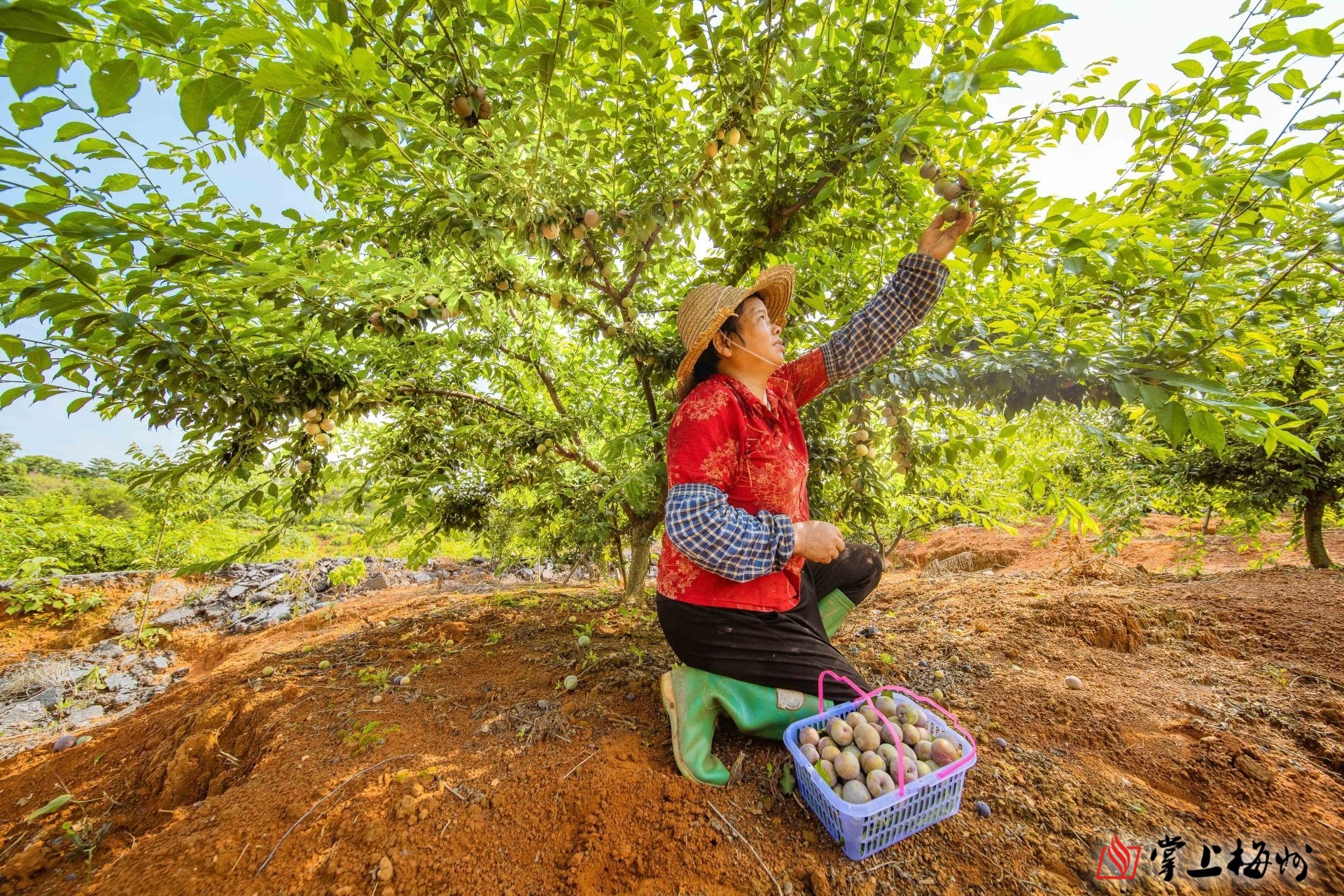 甜李绿了山头,强了产业,富了乡民。王春芬是基地的一名务工人员,近期,她与其他工人需要负责做好李果采收、果场育肥,防控病虫害等工作。“村里产业发展起来了,我们的日子越过越美了!目前,村里大概有100多号人都在这个基地忙活,每天收入大概是140元,稳定安心。” 王春芬说。
