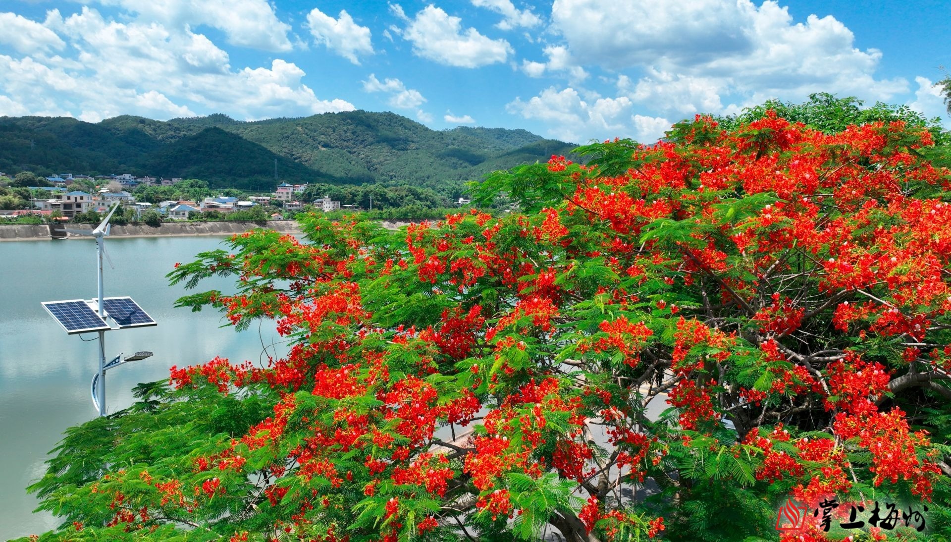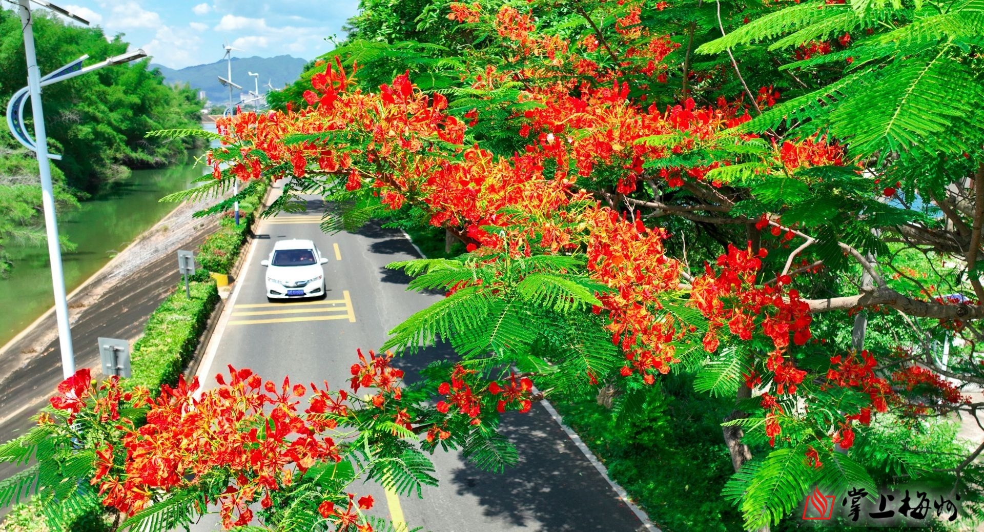 在县城城区,那炽热明艳的红色,搭配湛蓝如洗的天空,如同一幅浓墨重彩的经典油画,映得盛夏的蕉岭更加热情似火。“凤凰花花朵独特,花色艳红,美得肆意张扬、酣畅淋漓,明媚得令人挪不开眼睛,此外,此花给人以‘敢与骄阳争辉’的奋发感,激励我们积极向上、勇于冲破阻碍,充满正能量。”市民林欣然是一名返乡大学生,喜爱用镜头捕捉家乡之变化,用光影渲染家乡的美景,从而记录生活的美好瞬间。