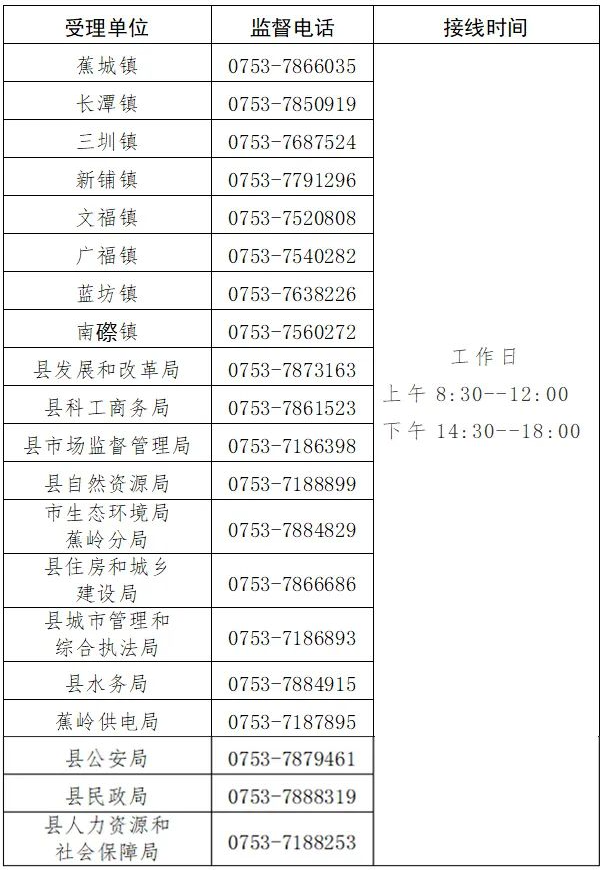 为深入贯彻落实蕉岭县委县政府加强作风建设的部署要求,进一步拓宽和畅通举报投诉渠道,及时受理反映作风建设存在的突出问题和意见建议,现将蕉岭县有关单位作风建设监督热线予以公布: