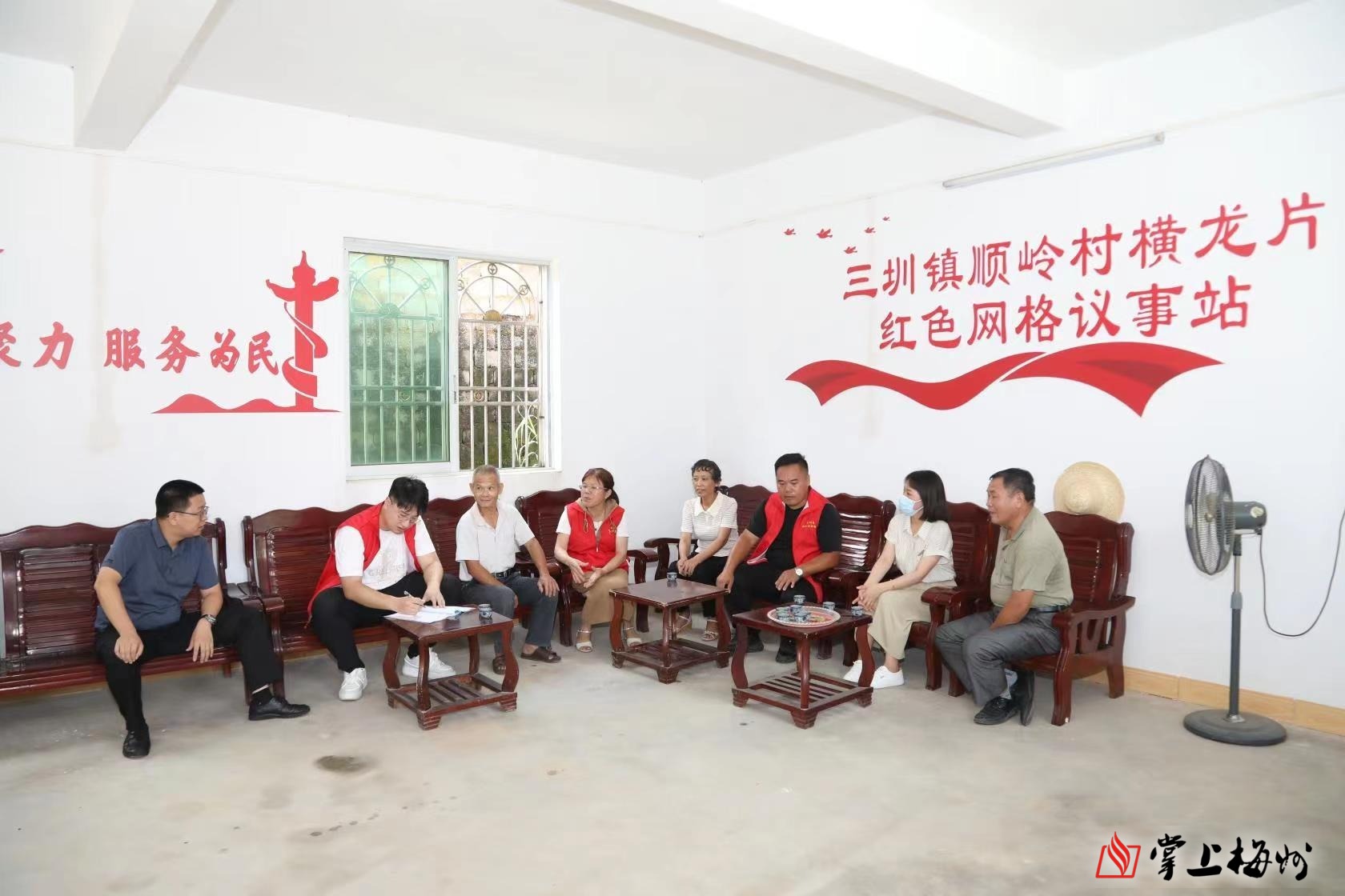 蝉鸣盛夏,风动蕉岭县三圳镇顺岭村横龙片红色网格议事站院落外的龙眼树簌簌作响,院里镇村干部、网格员与治理顾问团成员以及几名村民代表等各方代表共聚一堂,共议近期村里发生的喜事和治理难题,为推进乡村建设出谋划策。