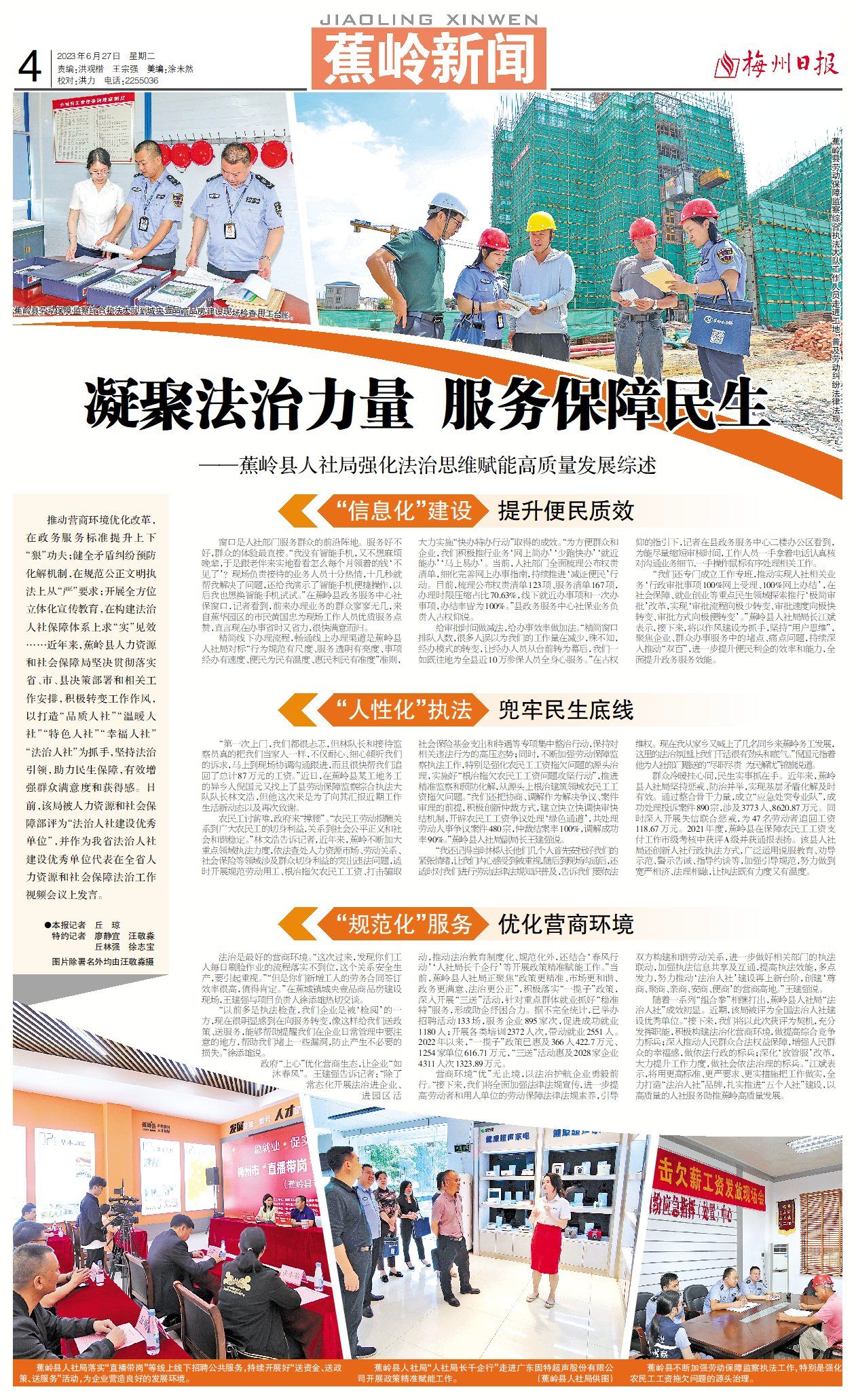 推动营商环境优化改革,在政务服务标准提升上下“狠”功夫;健全矛盾纠纷预防化解机制,在规范公正文明执法上从“严”要求;开展全方位立体化宣传教育,在构建法治人社保障体系上求“实”见效……近年来,蕉岭县人力资源和社会保障局坚决贯彻落实省、市、县决策部署和相关工作安排,积极转变工作作风,以打造“品质人社”“温暖人社”“特色人社”“幸福人社”“法治人社”为抓手,坚持法治引领,助力民生保障,有效增强群众满意度和获得感。日前,该局被人力资源和社会保障部评为“法治人社建设优秀单位”,并作为我省法治人社建设优秀单位代表在全省人力资源和社会保障法治工作视频会议上发言。
