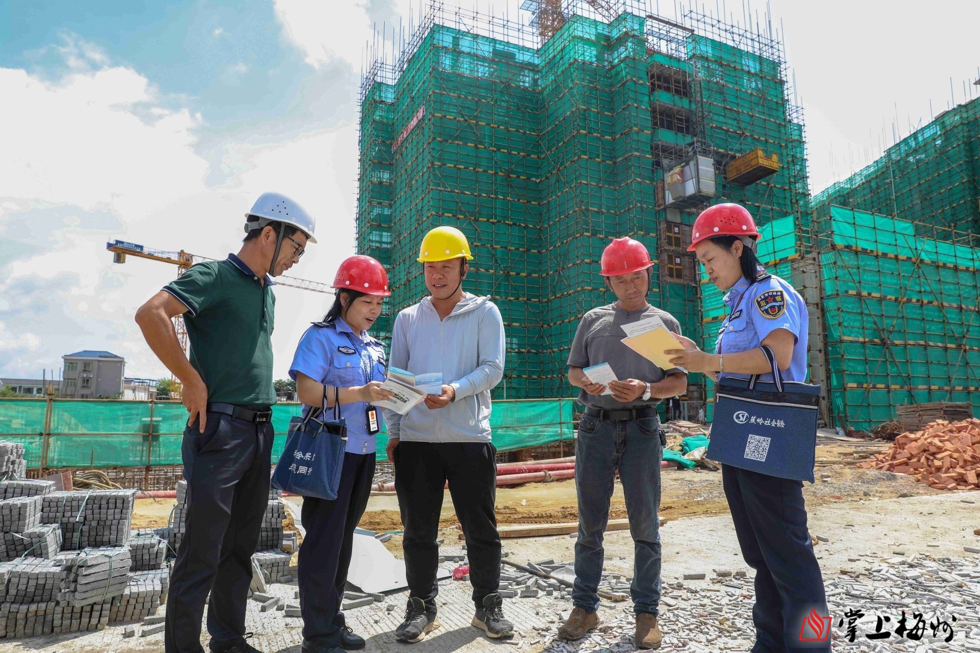 蕉岭县劳动保障监察综合执法大队工作人员走进工地,普及劳动纠纷法律法规。
