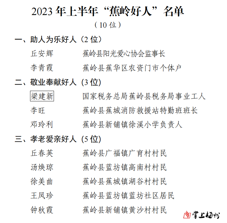 掌上梅州讯 为培育和践行社会主义核心价值观,选树道德典型,弘扬传统美德,蕉岭县文明办组织开展了2023年上半年“蕉岭好人”推荐评选活动。经各镇、各系统党委,县委教育工委以及县直相关主管部门广泛发动、层层推荐,县文明办严格把关、网上公示、组织召开评审会,确定丘安辉等10位同志为2023年上半年“蕉岭好人”。