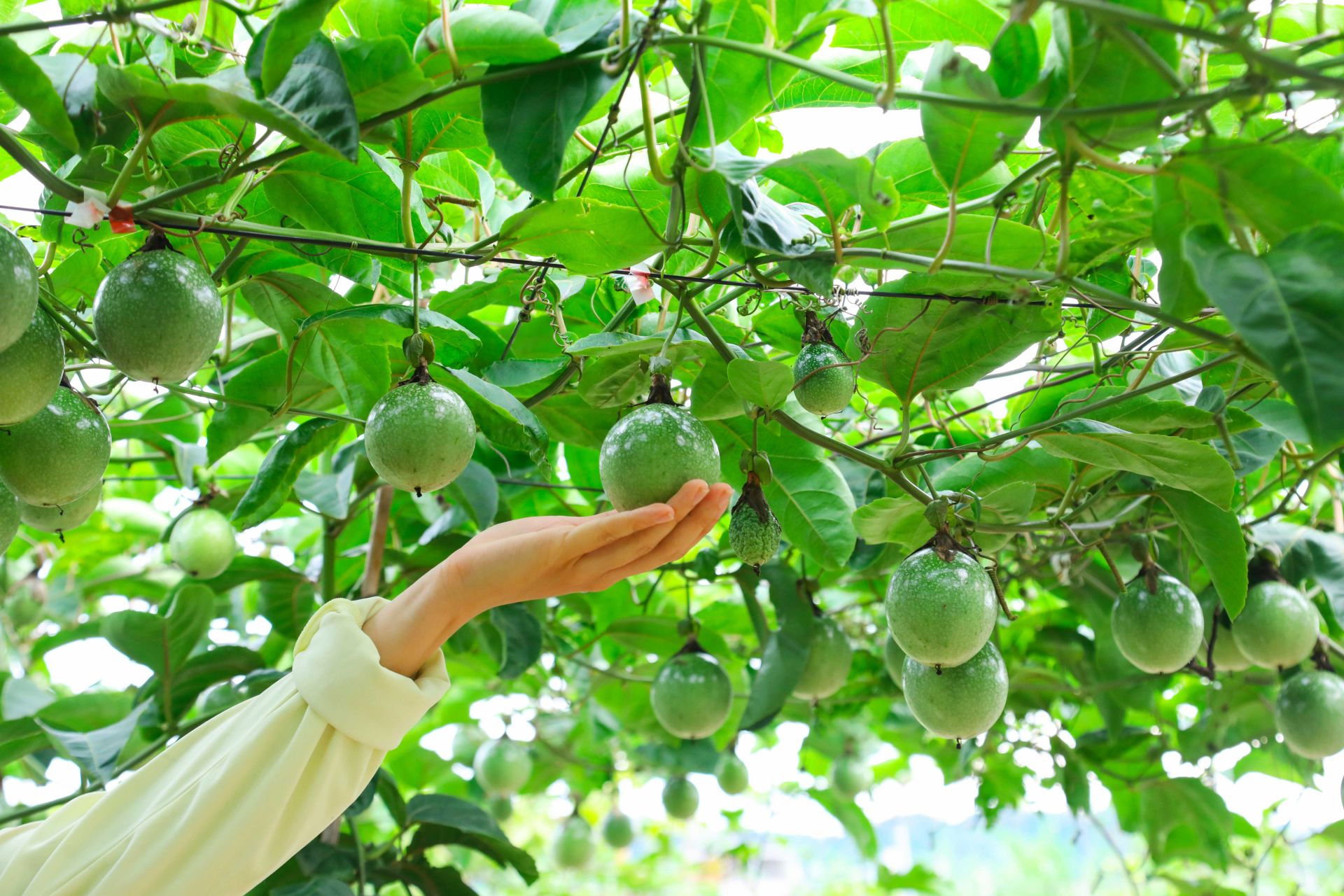 广福镇叶田村的百香果基地支架的藤蔓下,挤满一个个圆润又饱满的百香果。(丘林强 摄)