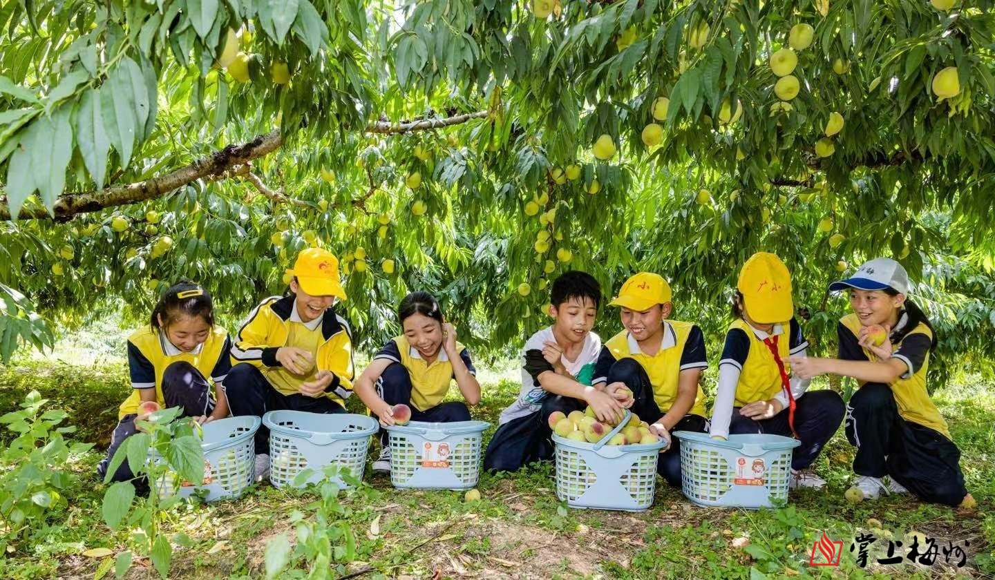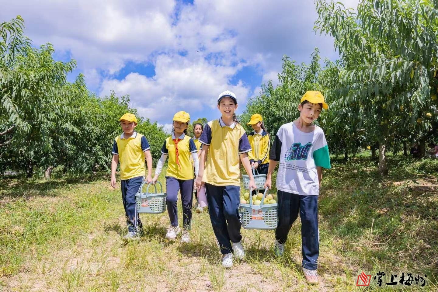 “这个桃子大,摘这个”“这个红,吃起来肯定甜!”桃林里忽然传来一阵嬉笑打闹声,原来是广福中心小学教师正组织学生在此开展暑期研学活动。只见一群穿着明艳校服的学生提着小篮子,开心地穿梭在桃树之间,不一会儿手中的篮子就装满了硕大的鹰嘴桃。