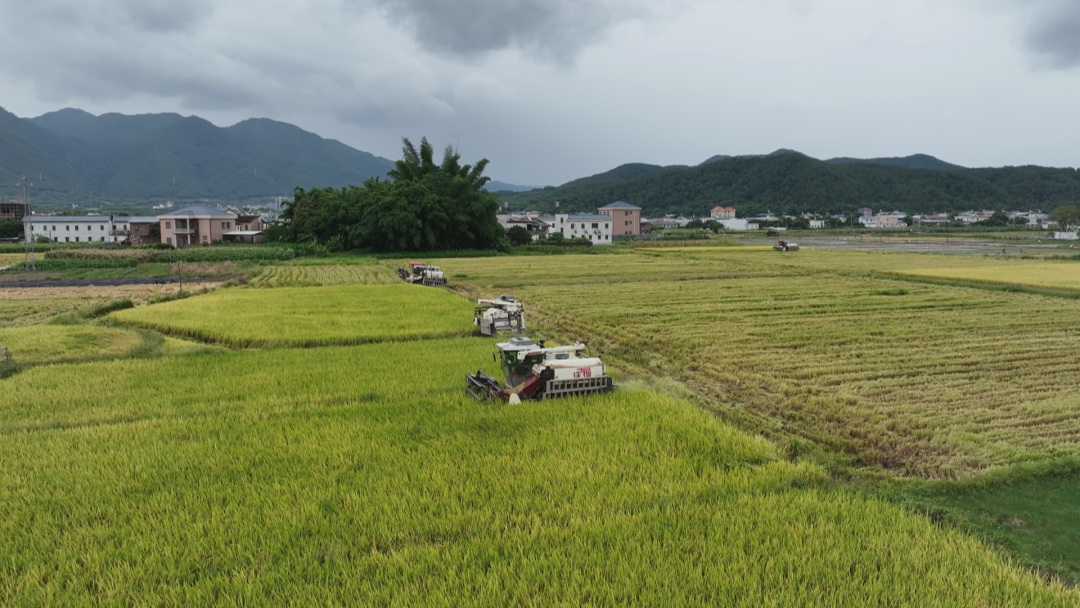 在三圳镇芳心村连片金黄的稻田里,沉甸甸的稻穗压弯了腰,五台收割机正开足马力,在稻田里来回穿梭,脱粒、装车……不一会儿就将运粮车装满了。种粮大户徐省华告诉记者,他今年承包种植了150亩的水稻,收割完后的湿稻谷将直接运往收购点售卖,不仅解决晒粮难的问题,也大大提高了他种粮的积极性。