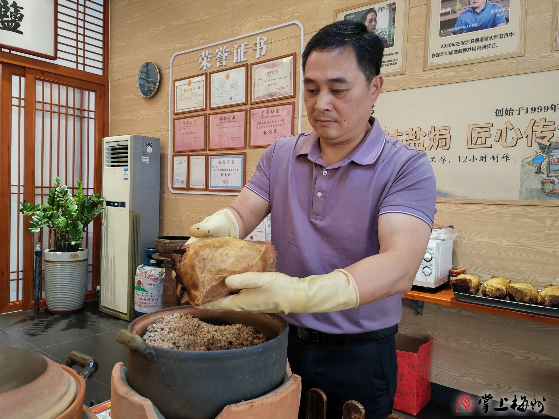 说起梅州特色美食,必有盐焗鸡的身影。在梅州美食圈子里,蕉岭县退役军人林裕民坚守传统技艺制作的盐焗鸡小有名气,他本人也是客家盐焗鸡制作技艺(蕉岭古法盐焗鸡制作技艺)的代表性传承人。他说,当过兵的人,最不怕的就是吃苦,为了梦想,披荆斩棘也甘之如饴。