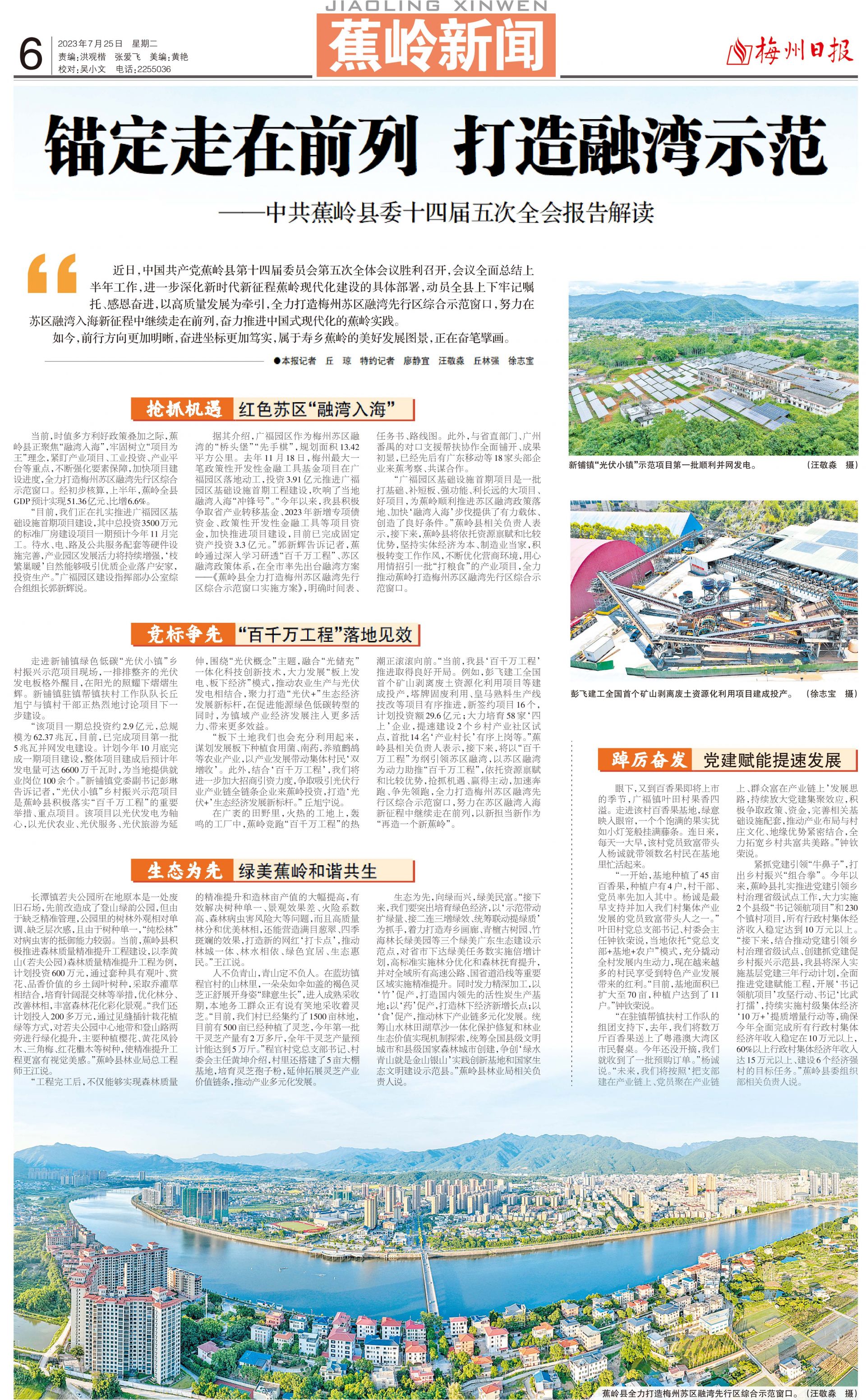 当前,时值多方利好政策叠加之际,蕉岭县正聚焦“融湾入海”,牢固树立“项目为王”理念,紧盯产业项目、工业投资、产业平台等重点,不断强化要素保障,加快项目建设进度,全力打造梅州苏区融湾先行区综合示范窗口。经初步核算,上半年,蕉岭全县GDP预计实现51.36亿元、比增6.6%。