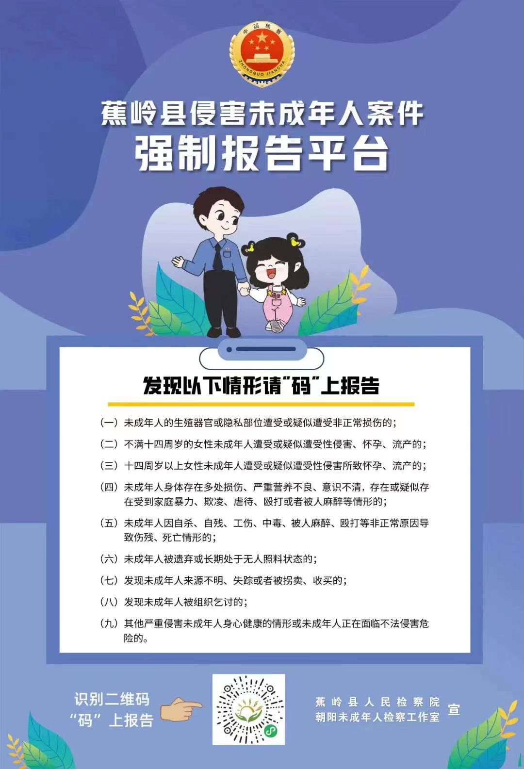 该平台聚焦性侵、虐待、欺凌、拐卖未成年人等9种强制报告情形,设有简单易操作的报告流程,支持图片、音视频等线索上传方式,负有报告责任的主体以及其他社会公众通过手机扫码方式即可进行报告,有效畅通快速发现、报告侵害未成年人违法犯罪线索渠道。同时,该平台涵盖情况查询、线索跟踪、处理反馈等检索功能,为检察机关办案人员及时收集证据、快速处理提供便利。