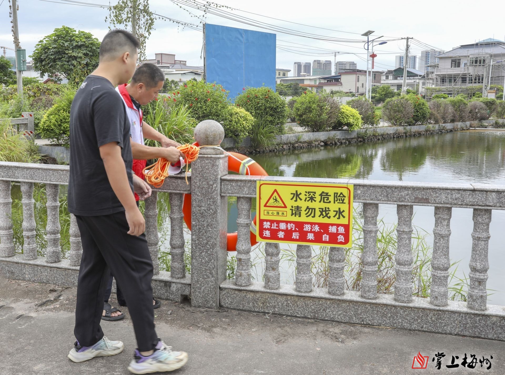 网格员在霞黄片水塘边察看救援设备。