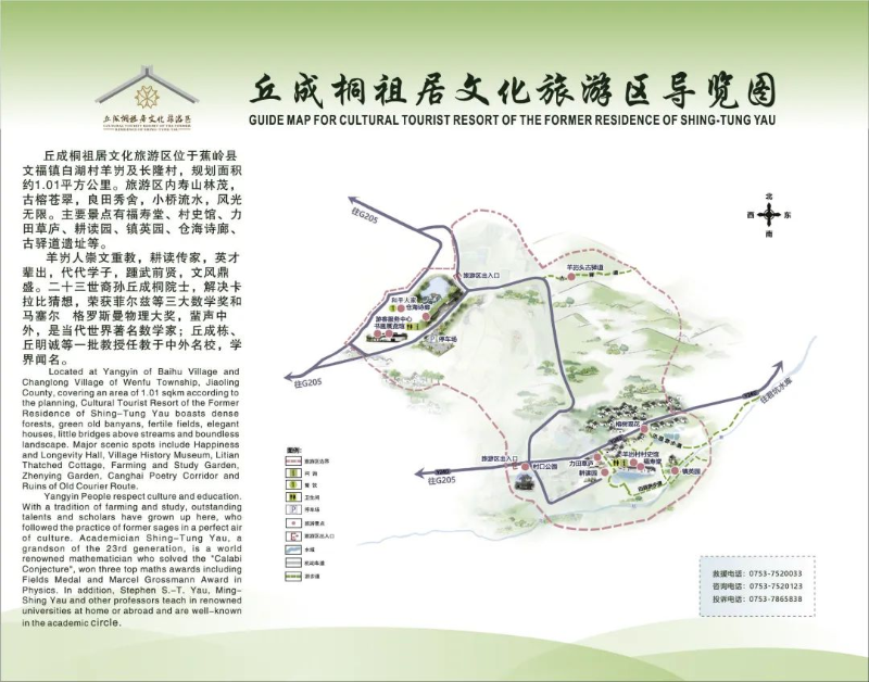 丘成桐祖居位于梅州市蕉岭县文福镇白湖村东面的羊岩村,旅游区内寿山林茂,古榕苍翠,良田秀舍,小桥流水,风光无限。主要景点有福寿堂、村史馆、力田草庐、耕读园、镇英园、仓海诗廊、古驿道遗址等。