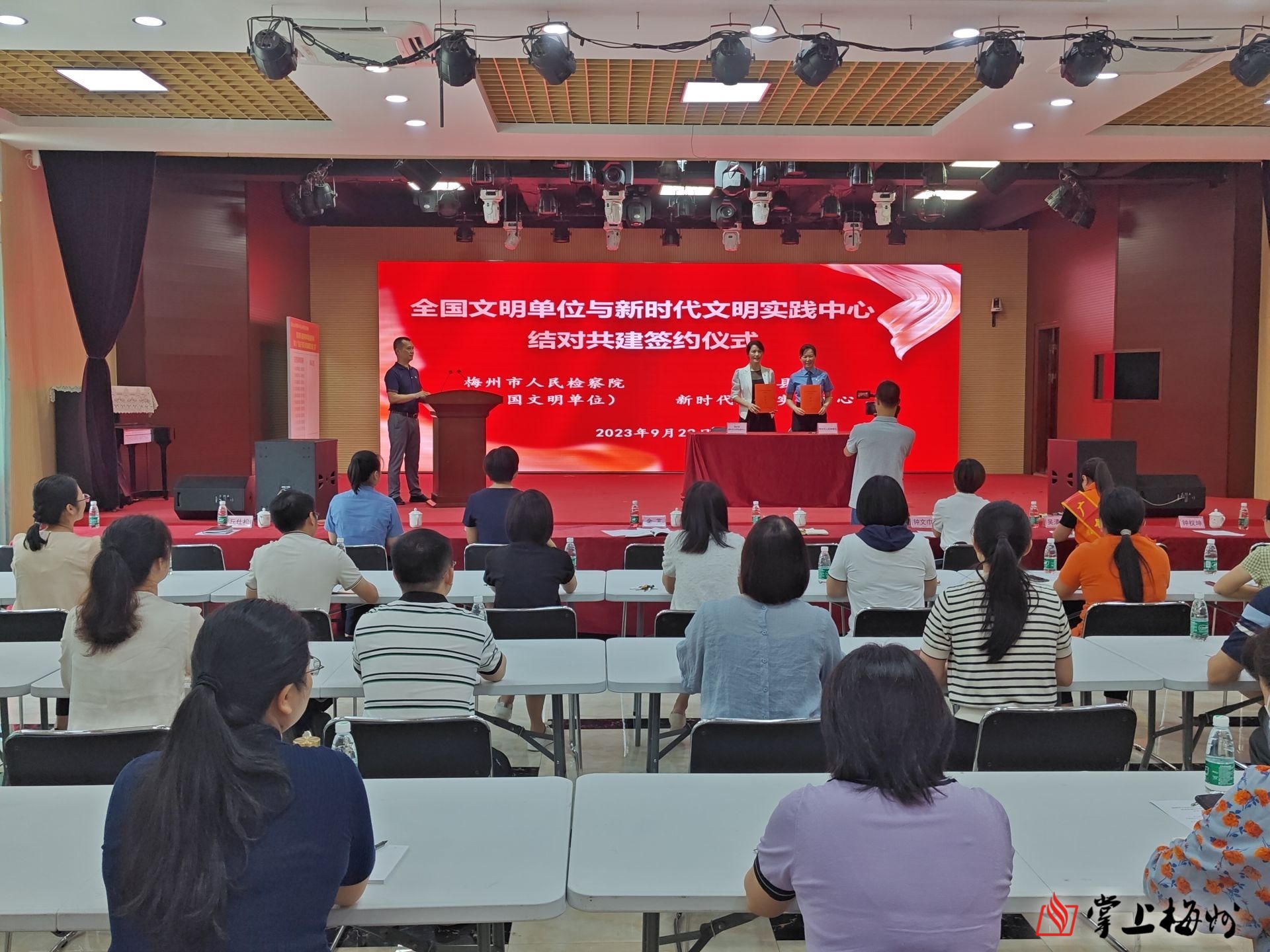 掌上梅州讯 日前,梅州市人民检察院与蕉岭县新时代文明实践中心结对共建签约暨“文明寿乡•德润万家”乡风文明建设宣传百村行启动仪式在蕉岭县举行。梅州市人民检察院党组成员、副检察长金芃,蕉岭县委常委、宣传部部长陈丽参加活动并讲话。