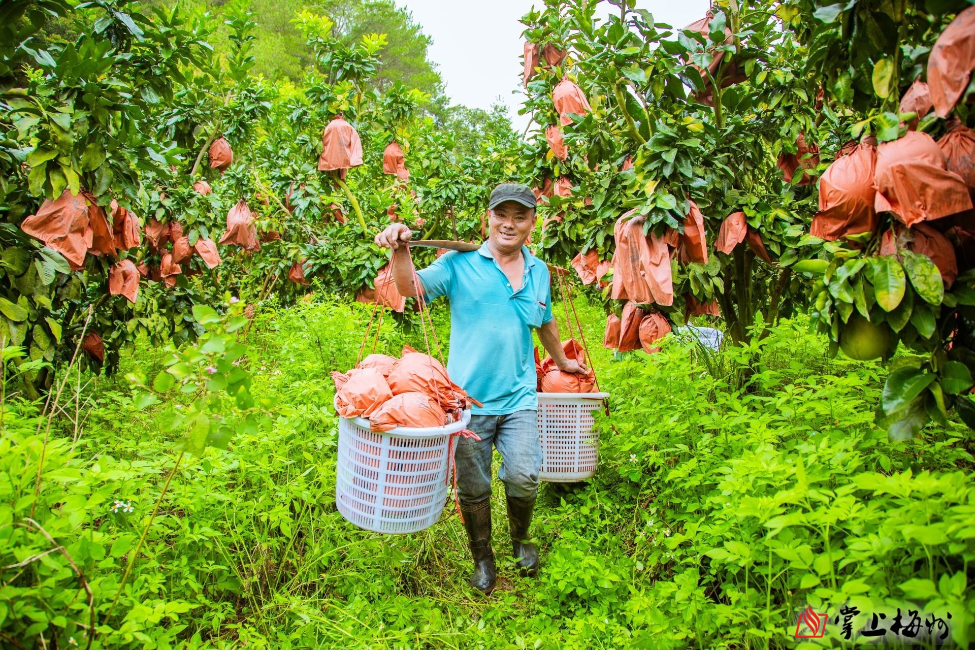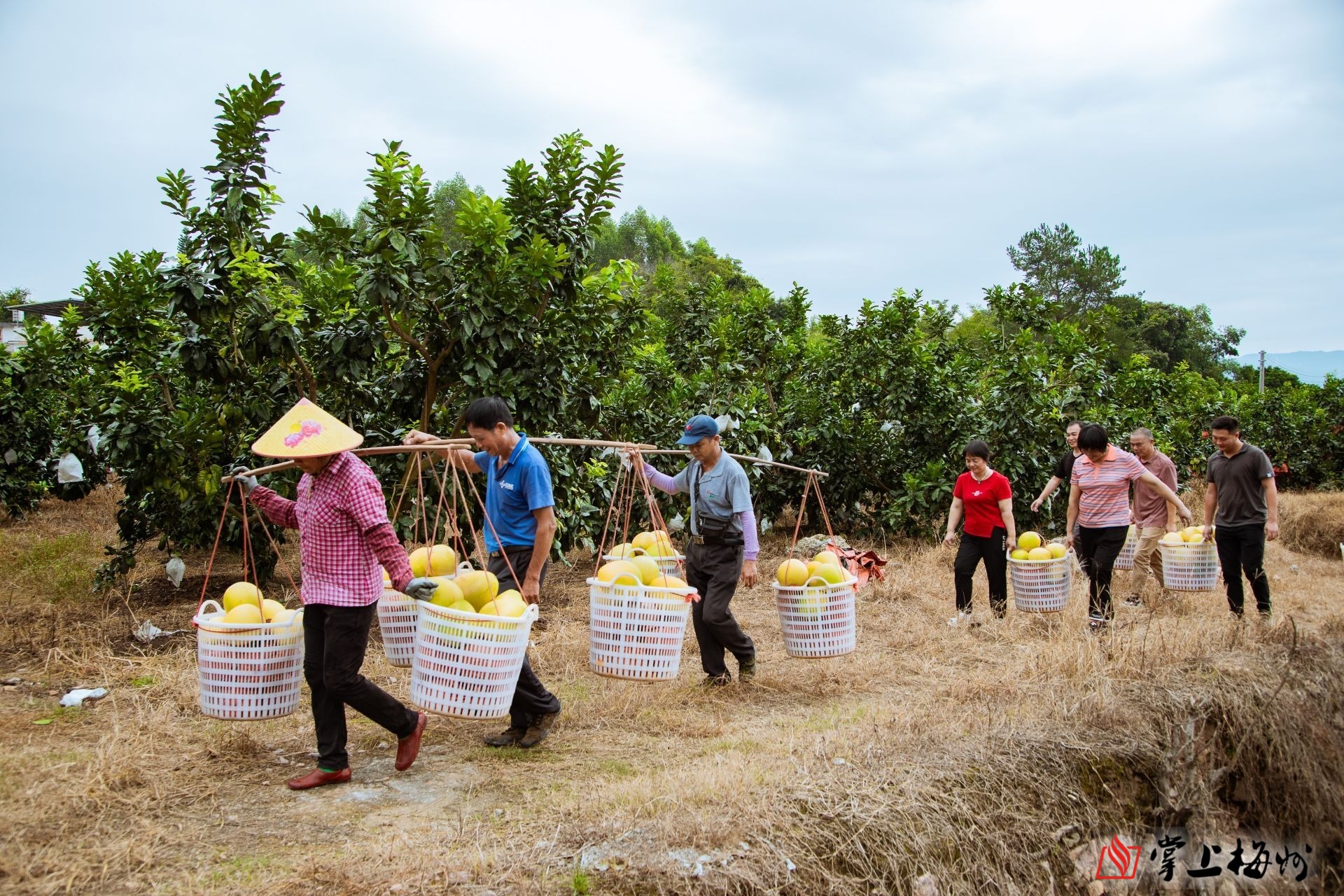 ▲村民们挑着刚下树的蜜柚来回穿梭在柚林间。