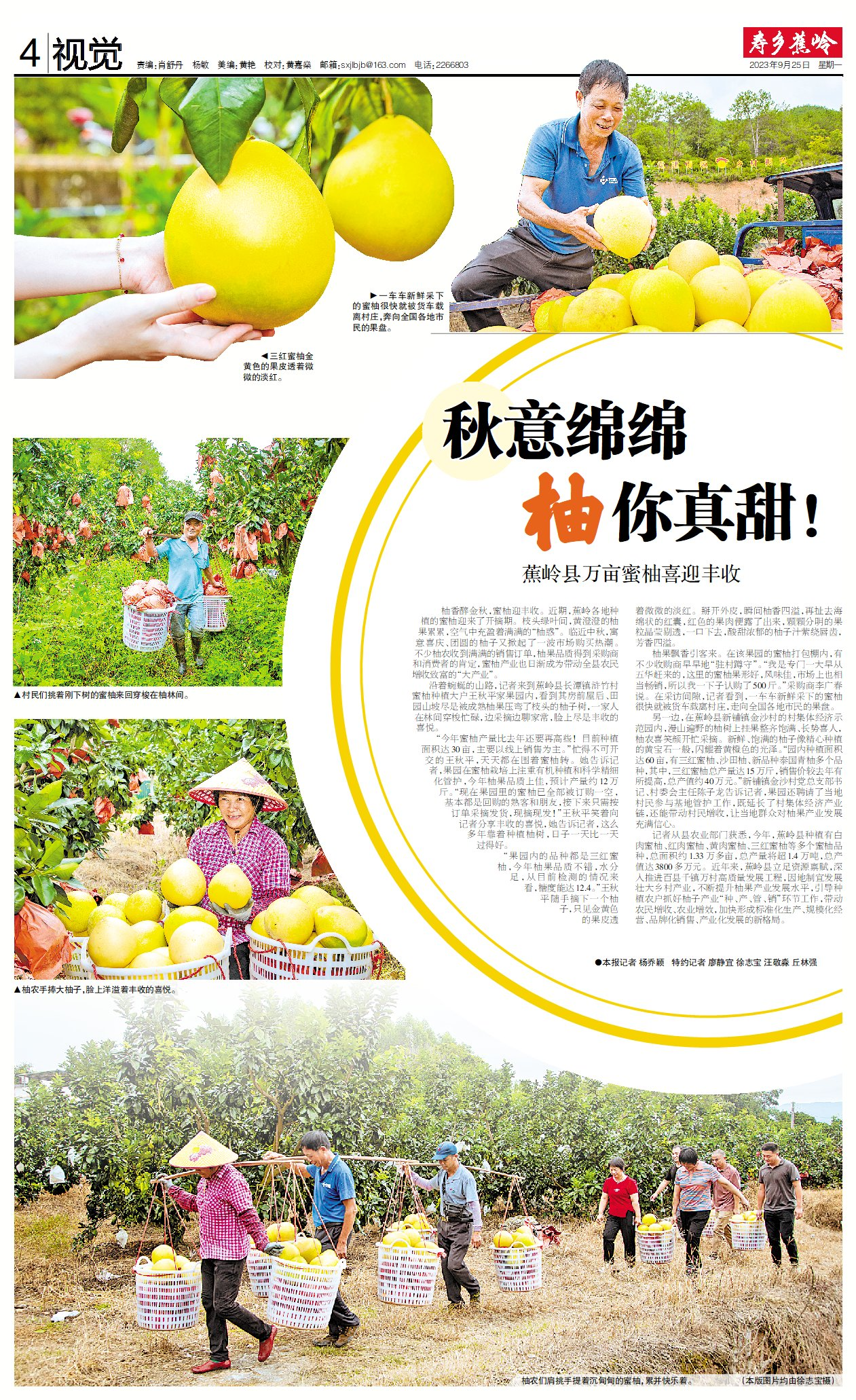 柚香醉金秋,蜜柚迎丰收。近期,蕉岭各地种植的蜜柚迎来了开摘期。枝头绿叶间,黄澄澄的柚果累累,空气中充盈着满满的“柚惑”。临近中秋,寓意喜庆、团圆的柚子又掀起了一波市场购买热潮。不少柚农收到满满的销售订单,柚果品质得到采购商和消费者的肯定,蜜柚产业也日渐成为带动全县农民增收致富的“大产业”。