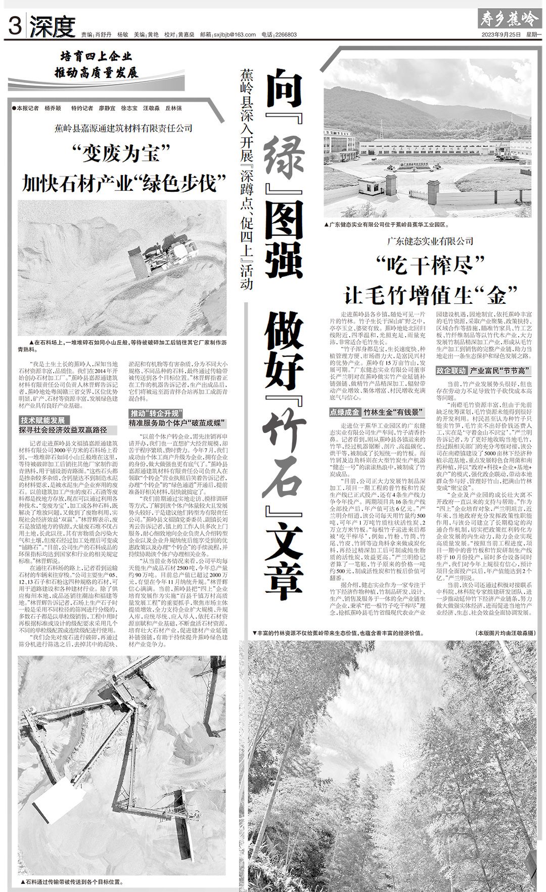 “竹子浑身都是宝,生长速度快、种植管理方便、市场潜力大,是富民兴村的优势产业。蕉岭有15万亩竹山,发展可期。”广东健态实业有限公司董事长严兰明对在蕉岭做实竹产业延链补链强链、做精竹产品精深加工,辐射带动产业增效、集体增富、村民增收充满底气与信心。