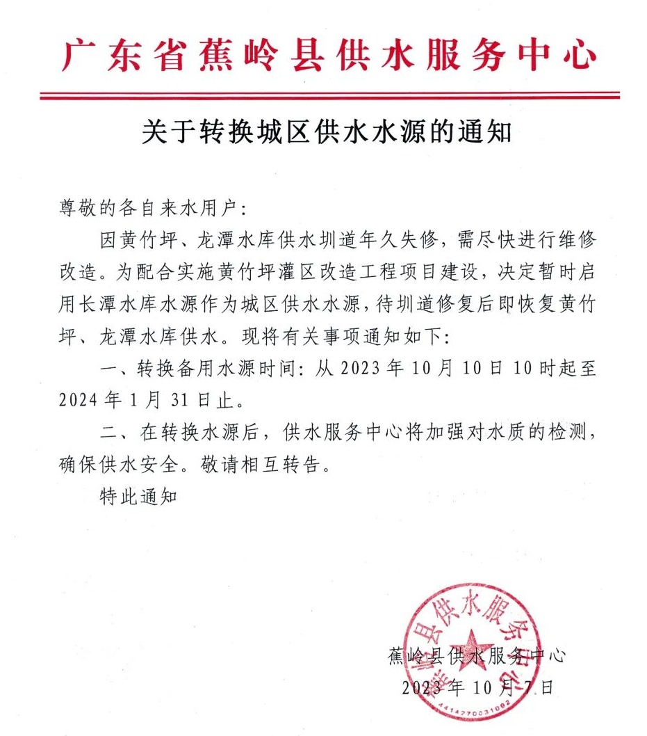 通知!10月10日起至明年1月31日,蕉岭城区将转换供水水源