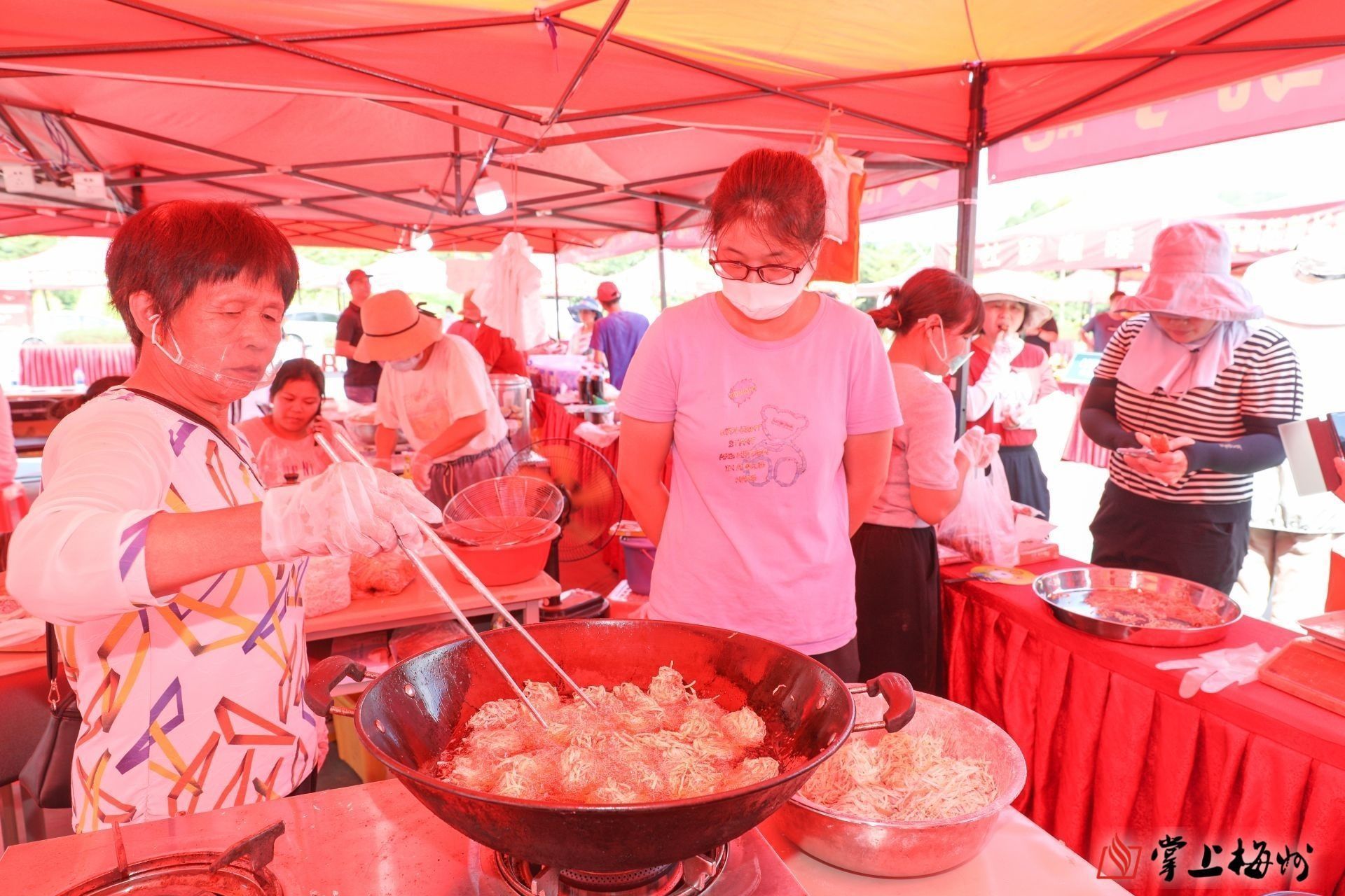 “今天带了约40斤的芋头,我们很早就过来准备摊位了,刨芋丝、炸芋丝圆。”正在忙碌刨芋头丝的摊主徐秋珍告诉记者,她听到文福镇有圩日活动,早上特地从三圳镇赶过来。“印象里的‘文福圩’是非常热闹的,今天活动刚好在中秋前一天,趁机会带孩子来感受圩日的氛围,我还邀了城里的朋友们,让他们也来体验圩日的热闹。”正在购买炸芋丝圆的文福镇居民傅艳红告诉记者,她购买了许多特色美食,准备寄给深圳的朋友,用美食传递佳节祝福。“这次在家门口赴圩,我已买了两趟了!一早买的东西先放回家里,现在又来了一趟。”提着大包小包的傅艳红笑着说道。