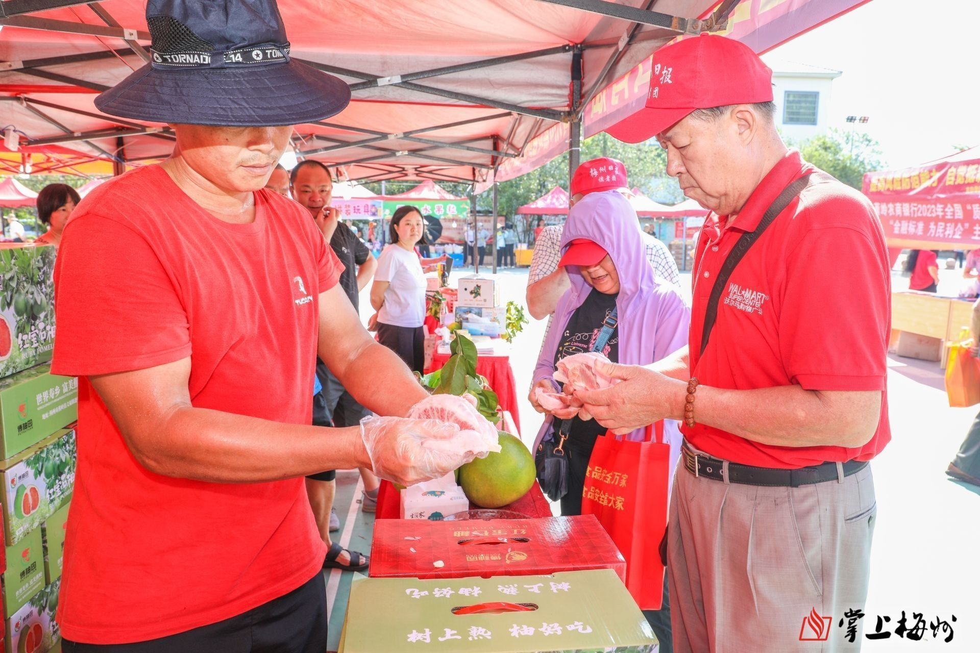 在活动展位上,逢甲泰国红宝石青柚吸引了不少人驻足。只见柚子外皮青翠欲滴,无一丝杂色。剖开果皮,柚肉红润饱满、颗粒分明,宛若一颗颗晶莹剔透的红宝石。“我们引进泰国柚种在文福本地种植,口感甜爽、水分充足。”梅州市延艺农业科技有限公司傅柚园有关负责人丘铭聪告诉记者,红宝石青柚多数销往上海、北京等一二线城市。今年因受台风天气影响,开摘期推迟至10月中旬,但目前预购订单已爆满。为了此次圩日活动,他们先精心挑选了一批柚子给父老乡亲和游客们品尝。